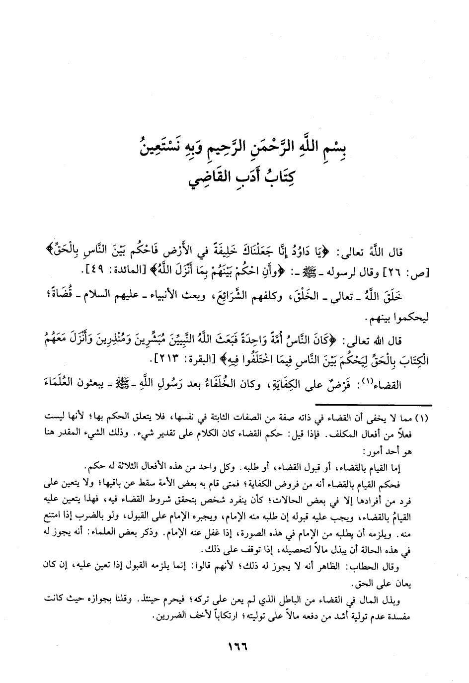 القضاء: فرض على الكفاية، وكان الخلفاء بعد رسول الله- صلى الله عليه وسلم- يبعثون العلماء
