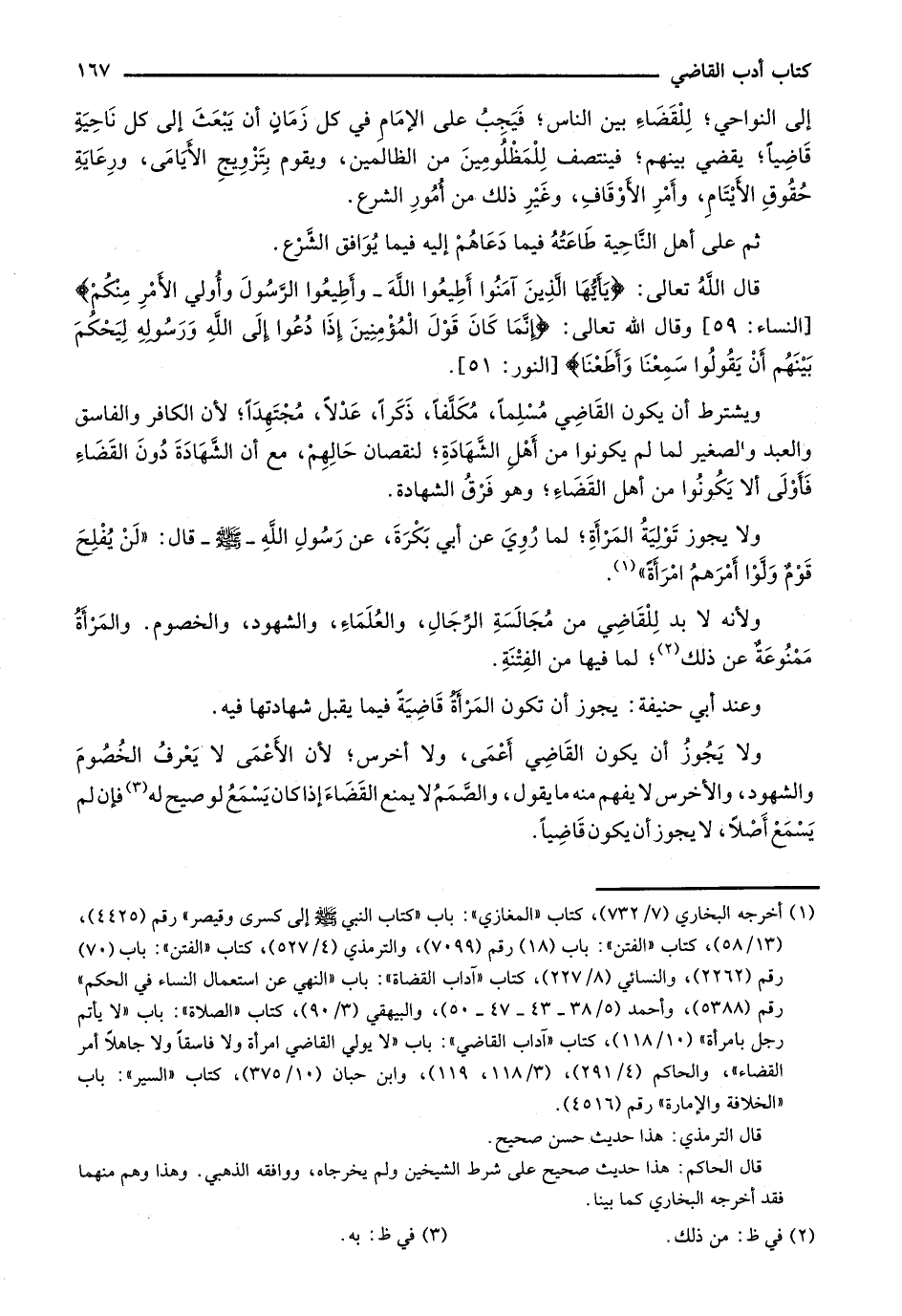 إلى النواحي؛ للقضاء بين الناس؛ فيجب على الإمام في كل زمان أن يبعث إلى كل ناحية قاضياً؛ يقضي بينهم؛ فينتصف للمظلومين من الظالمين، ويقوم بتزويج الأيامى، ورعاية حقوق الأيتام، وأمر الأوقاف، وغير ذلك من أمور الشرع.
