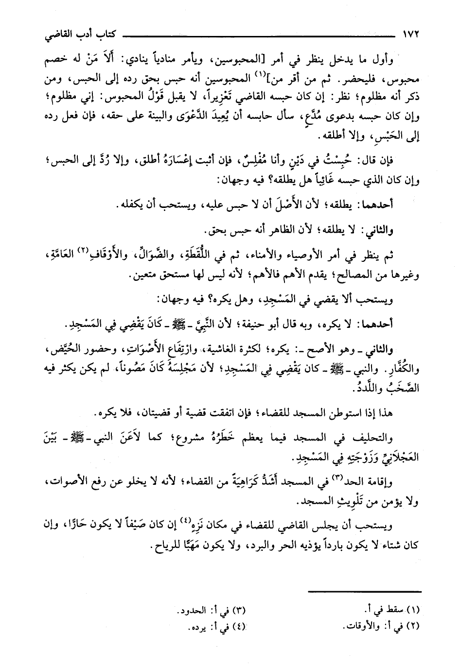 ويستحب أن يجلس القاضي للقضاء في مكان نزه إن كان صيفاً لا يكون حاراً، وإن كان شتاء لا يكون بارداً يؤذيه الحر والبر، ولا يكون مهباً للرياح.