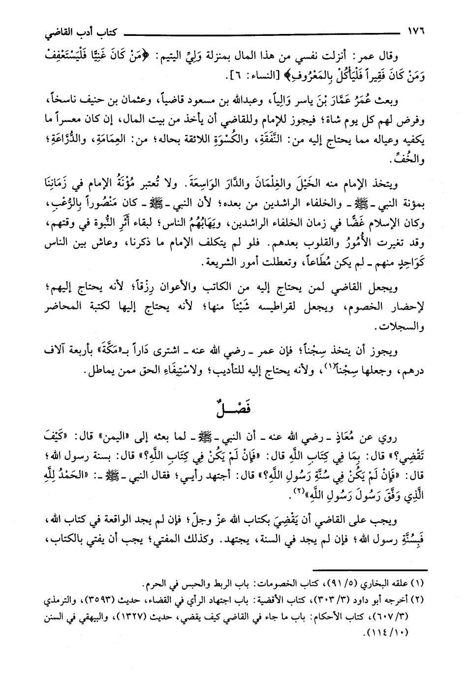 وبعث عمر عمار بن ياسر والياً، وعبد الله بن مسعود قاضياً، وعثمان بن حنيف ناسخاًن وفرض لهم كل يوم شاة؛ فيجوز للإمام وللقاضي أن يأخذ من بيت المال، إن كان معسراً ما يكفيه وعياله مما يحتاج إليه من: النفقة، والكسوة اللائقة بحاله؛ من: العمامة، والذراعة؛ والخف.