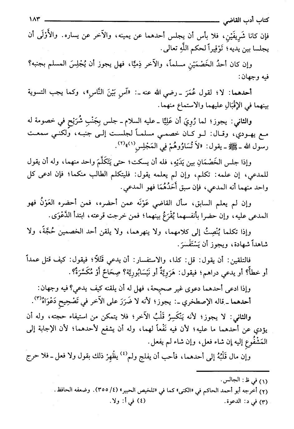 فإن كانا شريفين، فلا بأس أن يجلس أحدهما عن يمينه، والآخر عن يساره. والأولى أن يجلسا بين يديه؛ توقيراً لحكم الله تعالى.