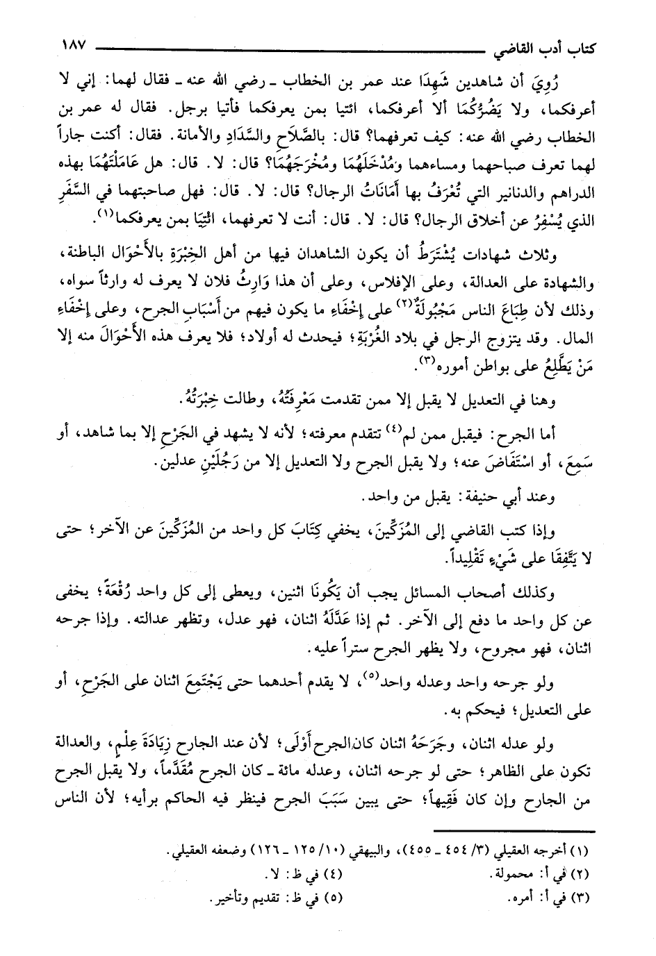 روي أن شاهدين شهدا عند عمر بن الخطاب- رضي الله عنه- فقال لهما: إني لا أعرفكما، ولا يضركما ألا أعرفكما، ائتيا بمن يعرفكما فأتيا برجل. فقال له عمر بن الخطاب رضي الله عنه: كيف تعرفهما؟ قال: بالصلاح والسداد والأمانة. فقال: أكنت جاراً لهما تعرف صباحهما ومساءهما ومدخلهما ومخرجهما؟ قال: لا. قال: هل عاملتهما بهذه الدراهم والدنانير التي تعرف بها أمانات الرجال؟ قال: لا. قال: فهل صاحبتهما في السفر الذي يسفر عن أخلاق الرجال؟ قال: لا. قال: أنت لا تعرفهما، ائتيا بمن يعرفكما.