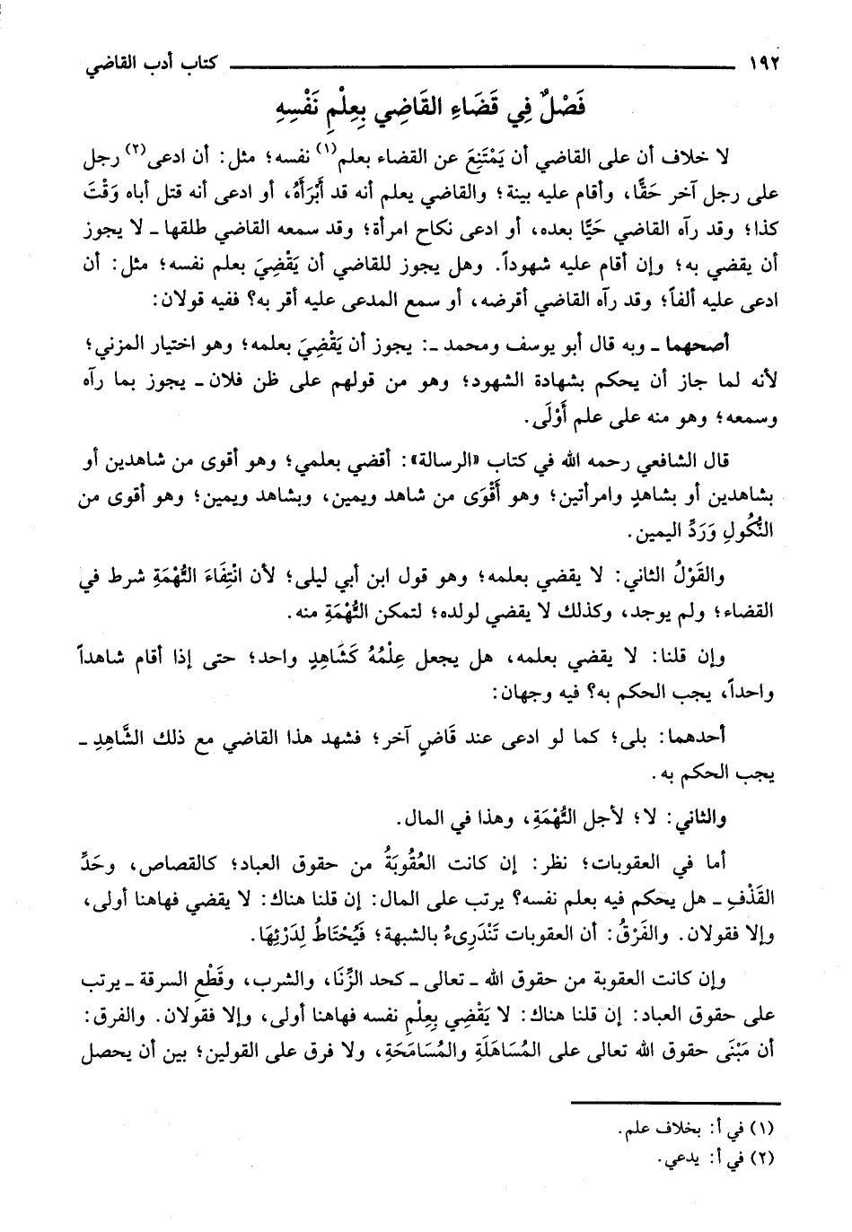 قال الشافعي رحمه الله في كتاب "الرسالة": أقضي بعلمي" وهو أقوى من شاهدين أو بشاهدين أو بشاهد وامرأتين، وهو أقوى من شاهد ويمين، وبشاهد ويمين؛ وهو أقوى من النكول ورد اليمين.