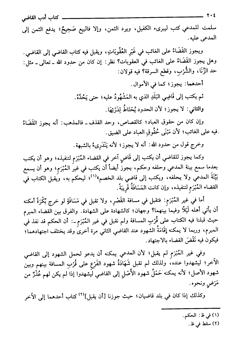 ويجوز القضاء على الغائب في غير العقوبات، ويقبل فيه كتاب القاضي إلى القاضي. وهل يجوز القضاء على الغائب في العقوبات؟ نظر: إن كان من حدود الله- تعالى- مثل: حد الزنا، والشرب، وقطع السرقة؟ فيه قولان: