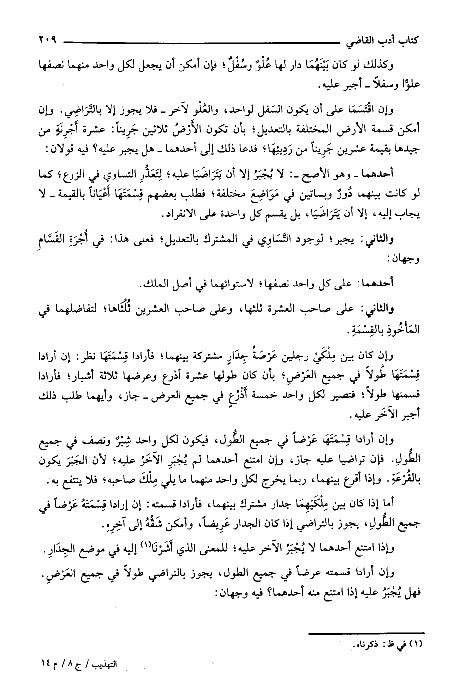 أما إذا كان بين ملكيهما جدار مشترك بينهما، فأرادا قسمته: إن أرادا قسمته عرضاً في جميع الطول، يجوز بالتراضي إذا كان الجدار عريضاً، وأمكن شقه إلى آخره.