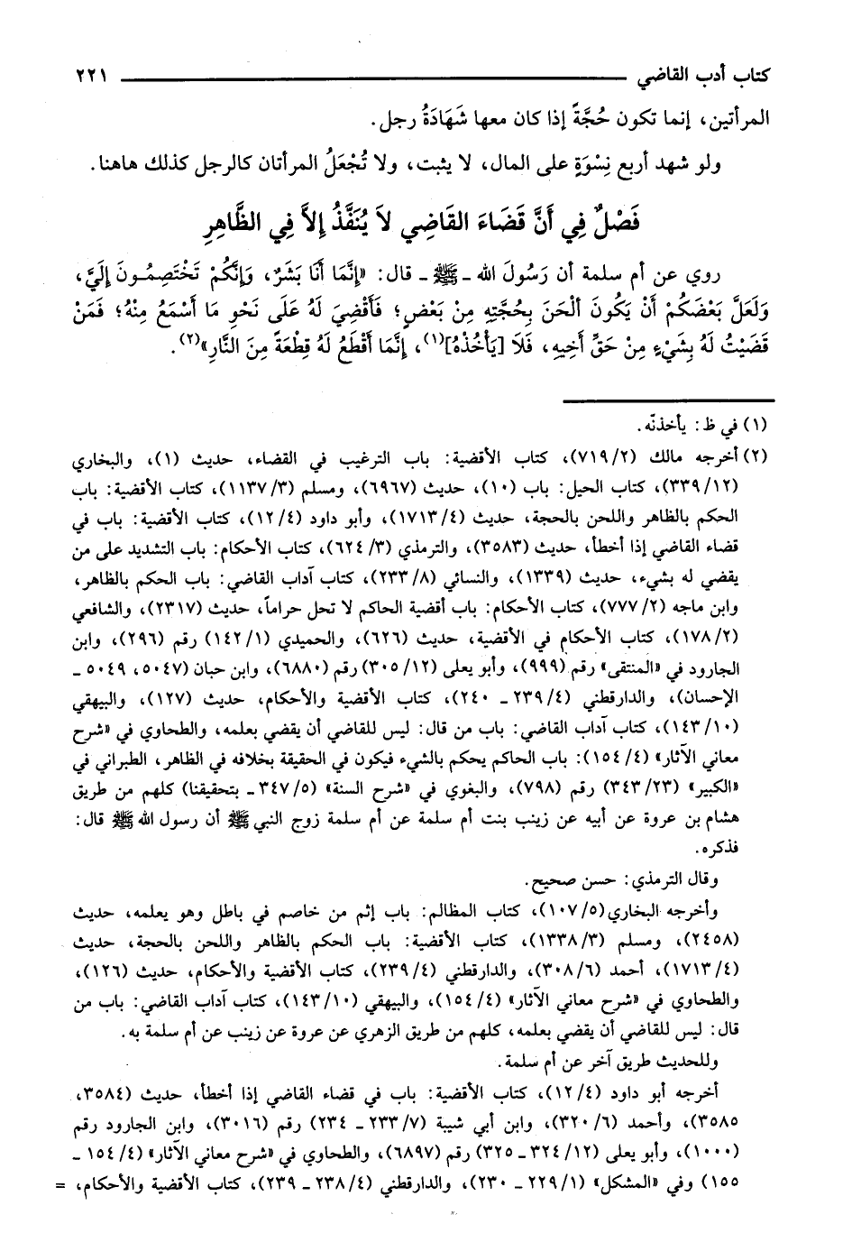 روي عن أم سلمة أن رسول الله- صلى الله عليه وسلم- قال: "إنما أنا بشر، وإنكم تختصمون إلي، ولعل بعضكم أن يكون ألحن بحجته من بعض؛ فأقضي له على نحو ما أسمع منه؛ فمن قضيت له بشيء من حق أخيه، فلا [يأخذه]، إنما أقطع له قطعة من النار".