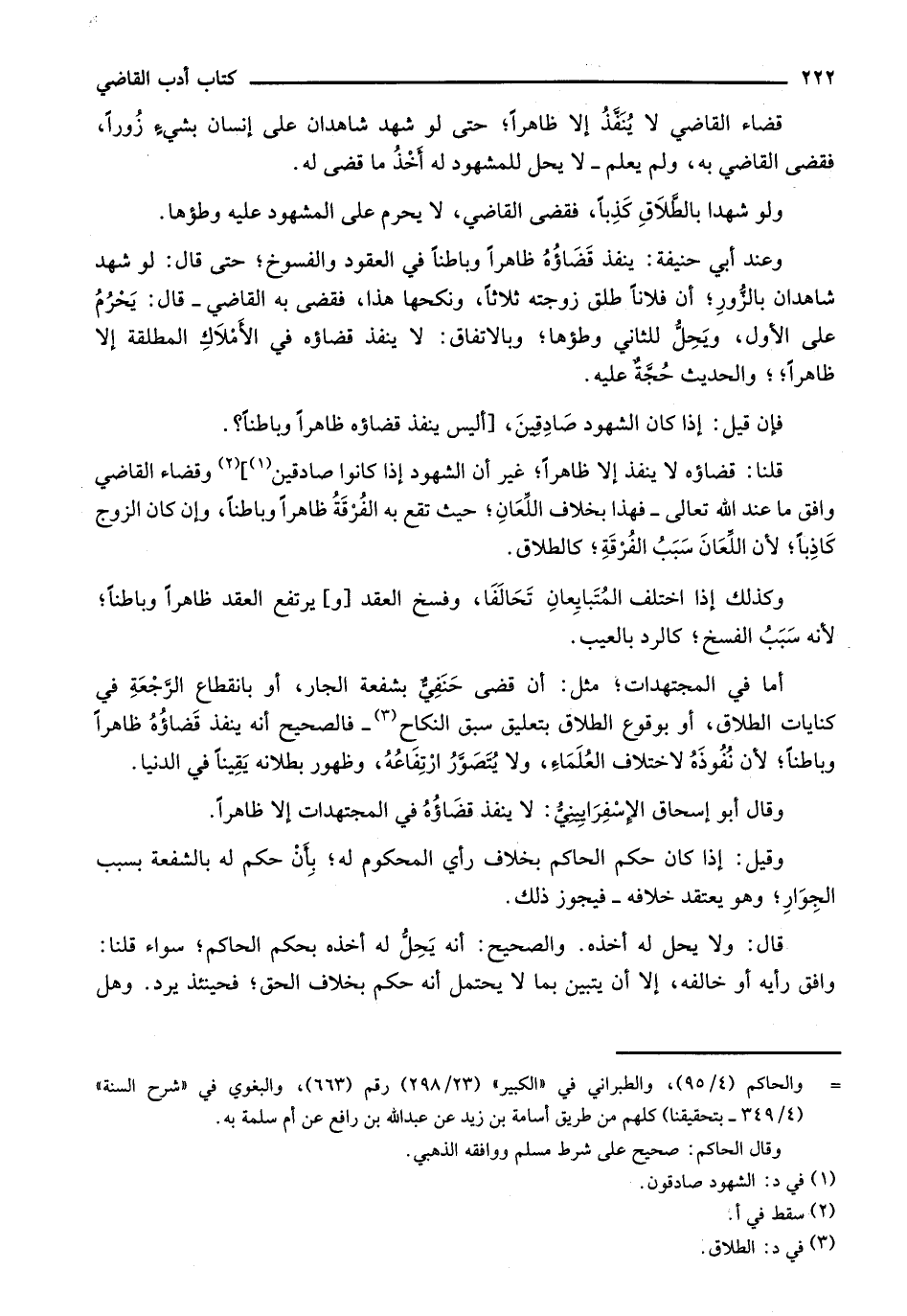 قضاء القاضي لا ينفذ إلا ظاهراً؛ حتى لو شهد شاهدان على إنسان بشيء زوراً، فقضى القاضي به، ولم يعلم- لا يحل للمشهود له أخذ ما قضى له.
