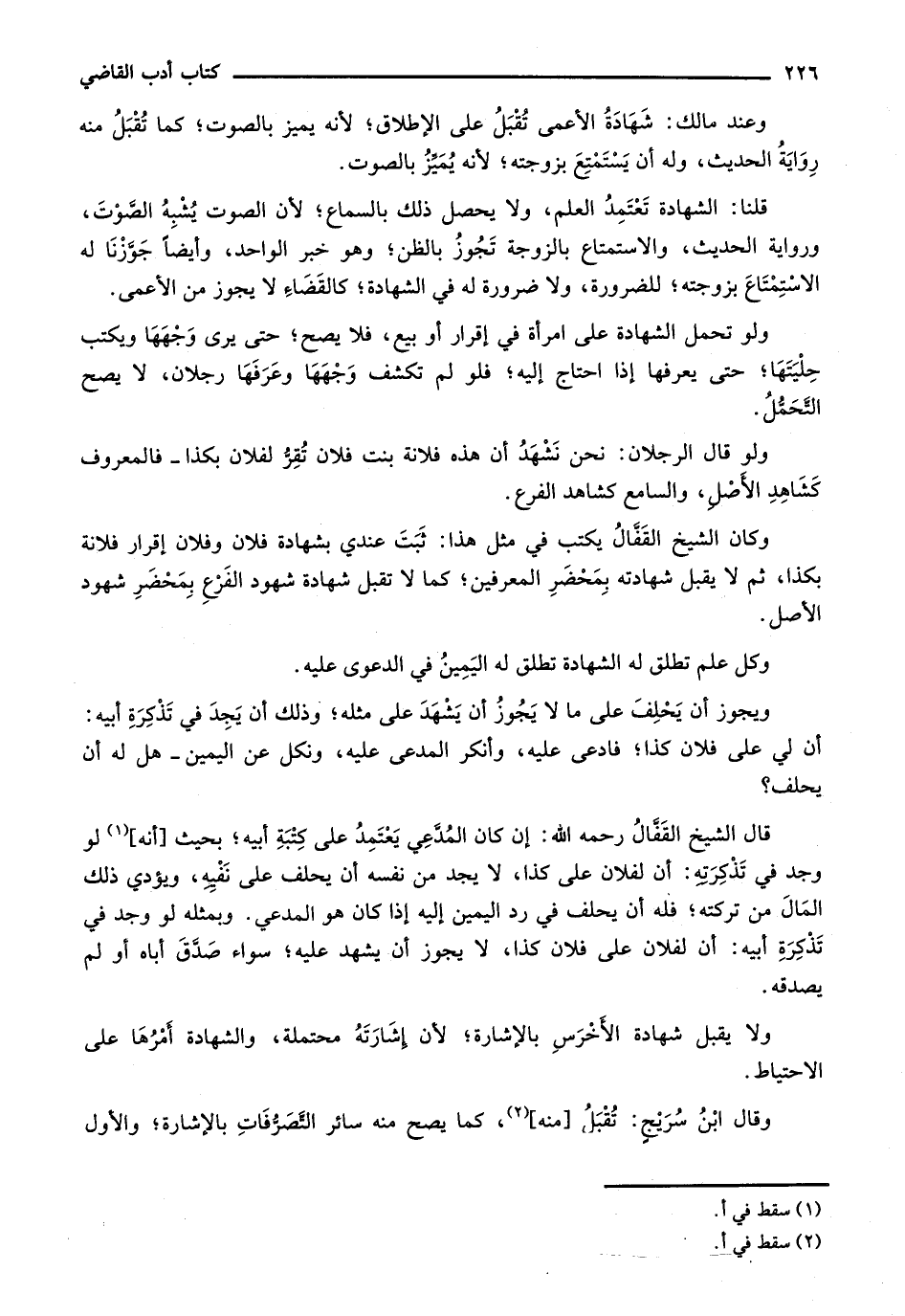 وعند مالك: شهادة الأعمى تقبل على الإطلاق؛ لأنه يميز بالصوت؛ كما تقبل منه رواية الحديث، وله أن يستمتع بزوجته؛ لأنه يميز بالصوت.