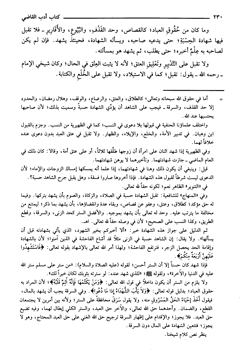 وما كان من حقوق العباد؛ كالقصاص، وحد القذف، والبيوع، والأقارير- فلا تقبل فيها شهادة الحسبة؛ حتى يدعيه صاحبه، ويسأله الشهادة، فحينئذ يشهد. فإن لم يكن لصاحبه به علم أخبره؛ حتى يطلب، ثم يشهد هو بمسألته.