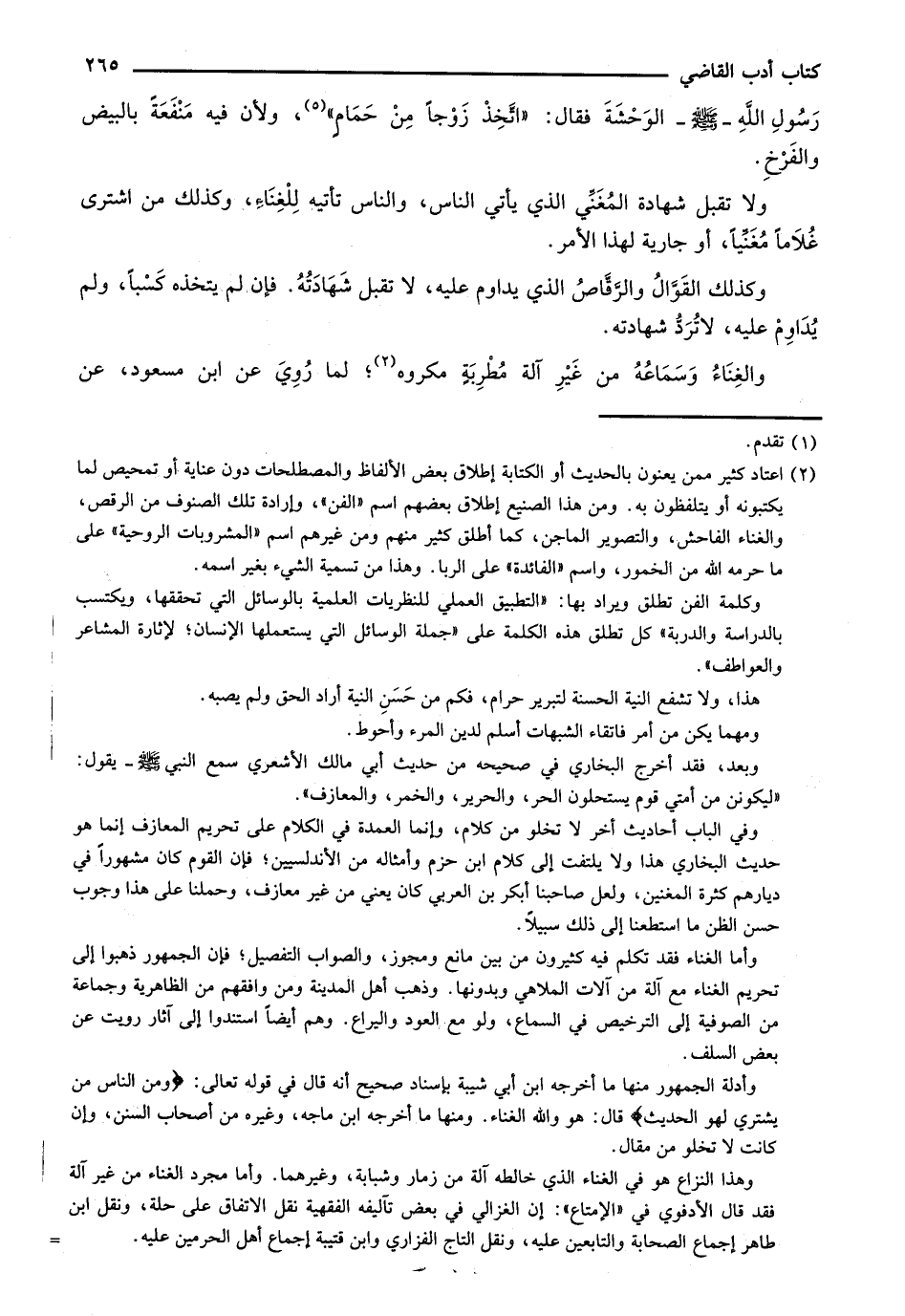 ولا تقبل شهادة المغني الذي يأتي الناس، والناس تأتيه للغناء، وكذلك من اشترى غلاماً مغنياً، أو جارية لهذا الأمر.