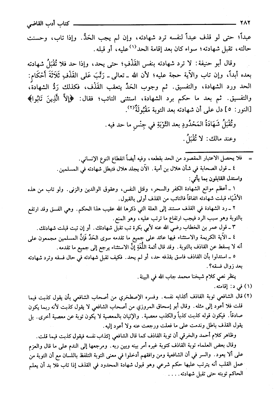 وقال أبو حنيفة: لا ترد شهادته بنفس القذف؛ حتى يحد، وإذا حد فلا تقبل شهادته بعده أبداً، وإن تاب والآية حجة عليه، لأن الله- تعالى- رتب على القذف ثلاثة أحكام: الحد ورد الشهادة، والتفسيق. ثم وجوب الحد يتعقب القذف، فكذلك رد الشهادة، والتفسيق. ثم بعد ما حكم برد الشهادة، استثنى التائب؛ فقال: {إِلاَّ الَّذِينَ تَابُوا} [النور: 5] دل على أن شهادته بعد التوبة مقبولة.