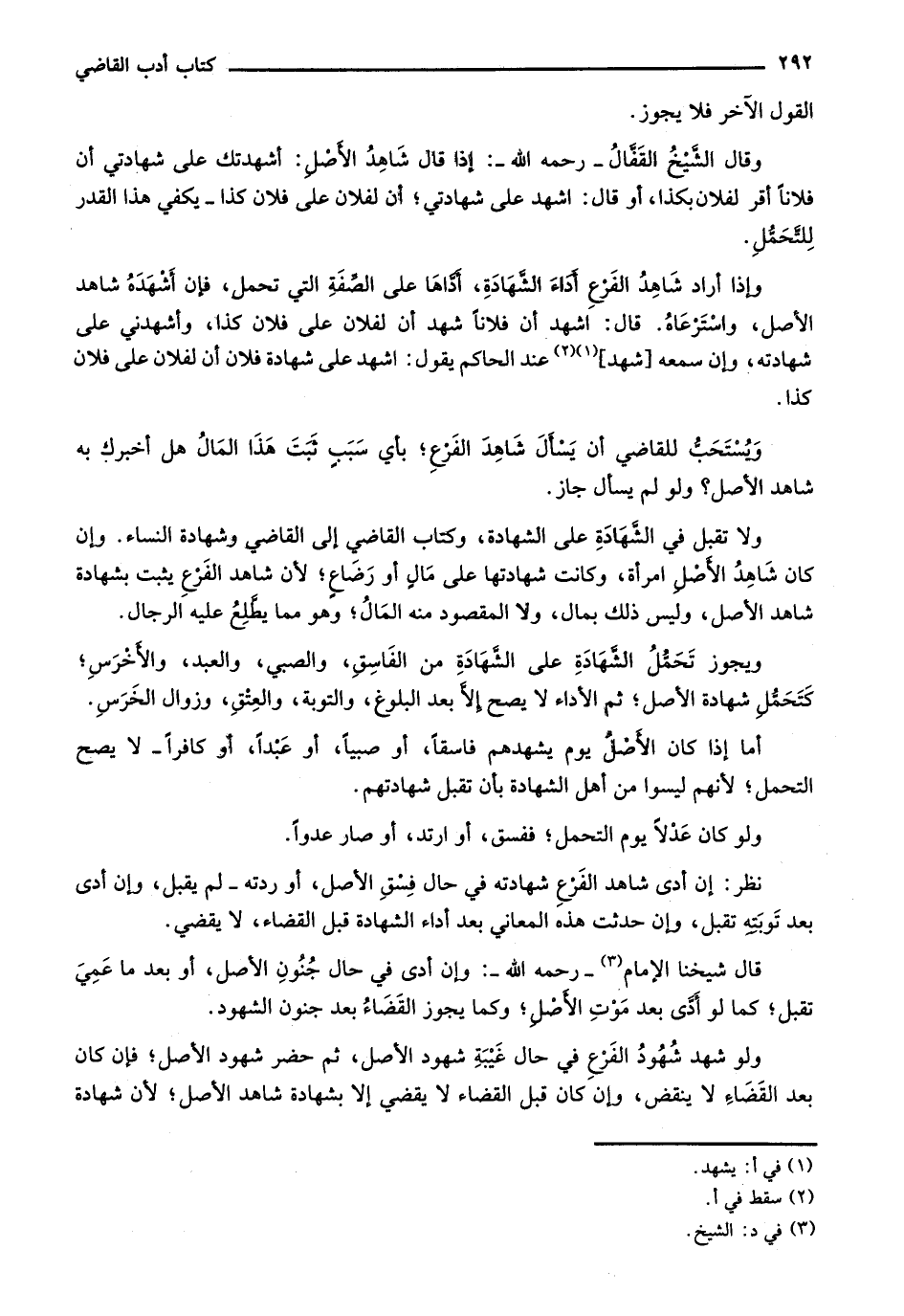 نظر: إن أدى شاهد الفرع شهادته في حال فسق الأصل، أو ردته- لم يقبل، وإن أدى بعد توبته تقبل، وإن حدثت هذه المعاني بعد أداء الشهادة قبل القضاء، لا يقضي.