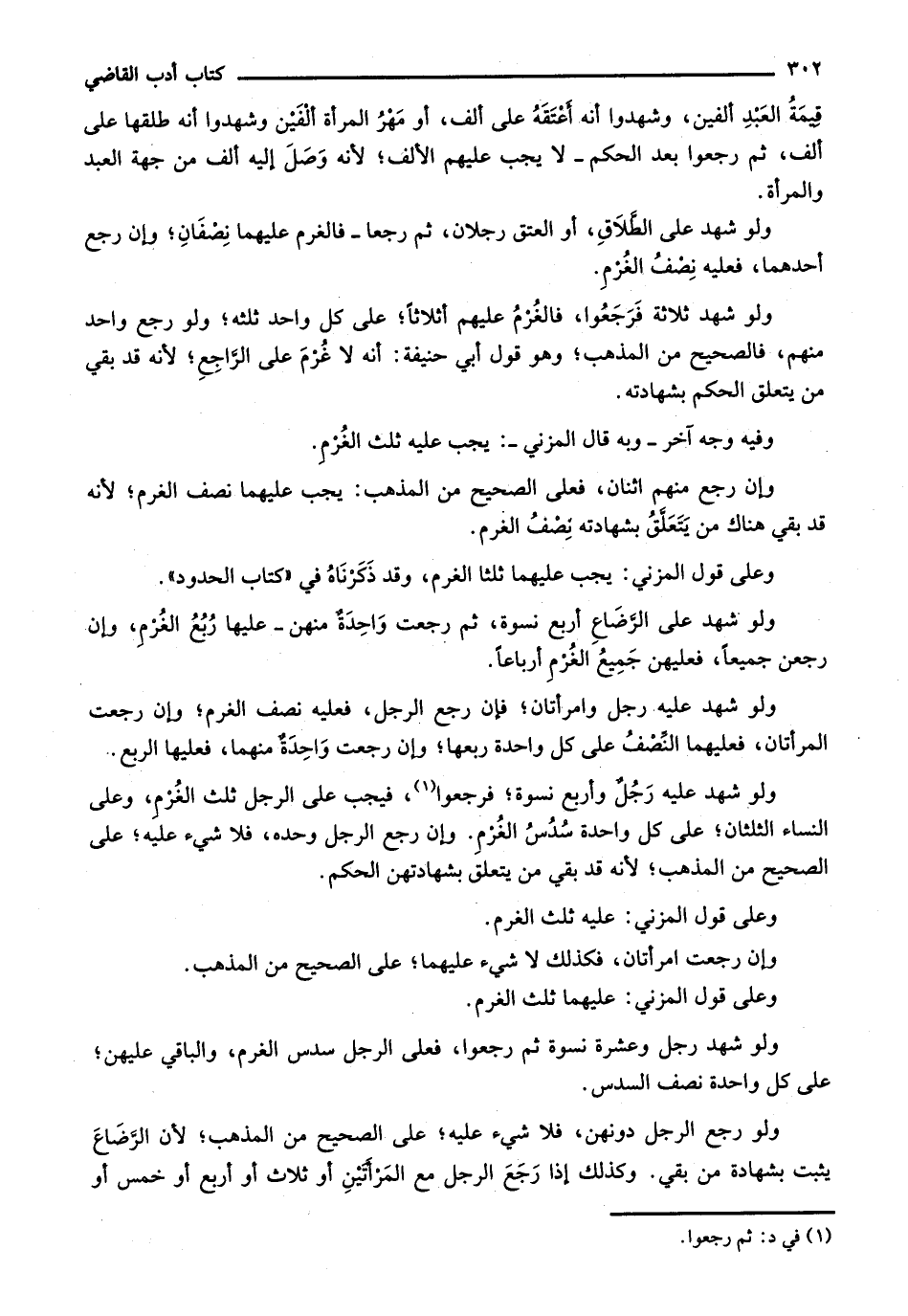 ولو شهد عليه رجل وأربع نسوة؛ فرجعوا، فيجب على الرجل ثلث الغرم، وعلى النساء الثلثان؛ على كل واحدة سدس الغرم. وإن رجع الرجل وحده، فلا شيء عليه؛ على الصحيح من المذهب؛ لأنه قد بقي من يتعلق بشهادتهن الحكم.