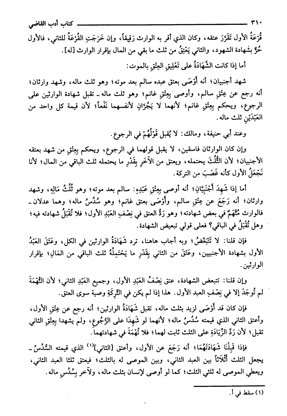 أما إذا شهد أجنبيان؛ أنه أوصى بعتق عبده: سالم بعد موته؛ وهو ثلث ماله، وشهد وارثان؛ أنه رجع عن عتق سالم، وأوصى بعتق غانم، وهو سدس ماله؛ وهما عدلان- فالوارث متهم في بعض شهادته، وهو رد العتق في نصف العبد الأول؛ فلا تقبل شهادته فيه؛ وهل تقبل في الباقي؟ فعلى قولي تبعيض الشهادة.