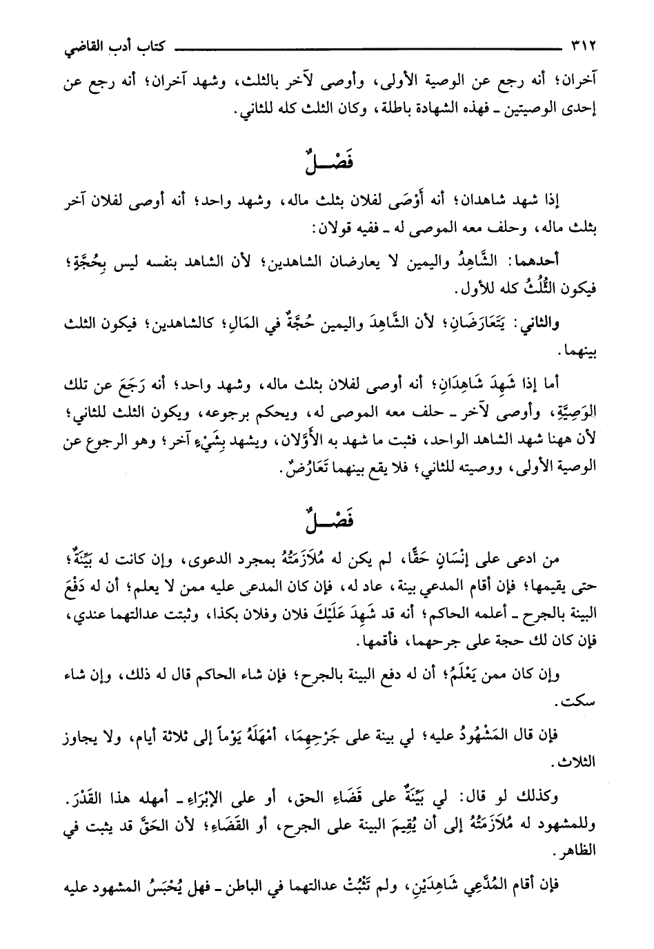 آخران؛ أنه رجع عن الوصية الأولى، وأوصى لآخر بالثلث، وشهد آخران؛ أنه رجع عن إحدى الوصيتين- فهذه الشهادة باطلة، وكان الثلث كله للثاني.
