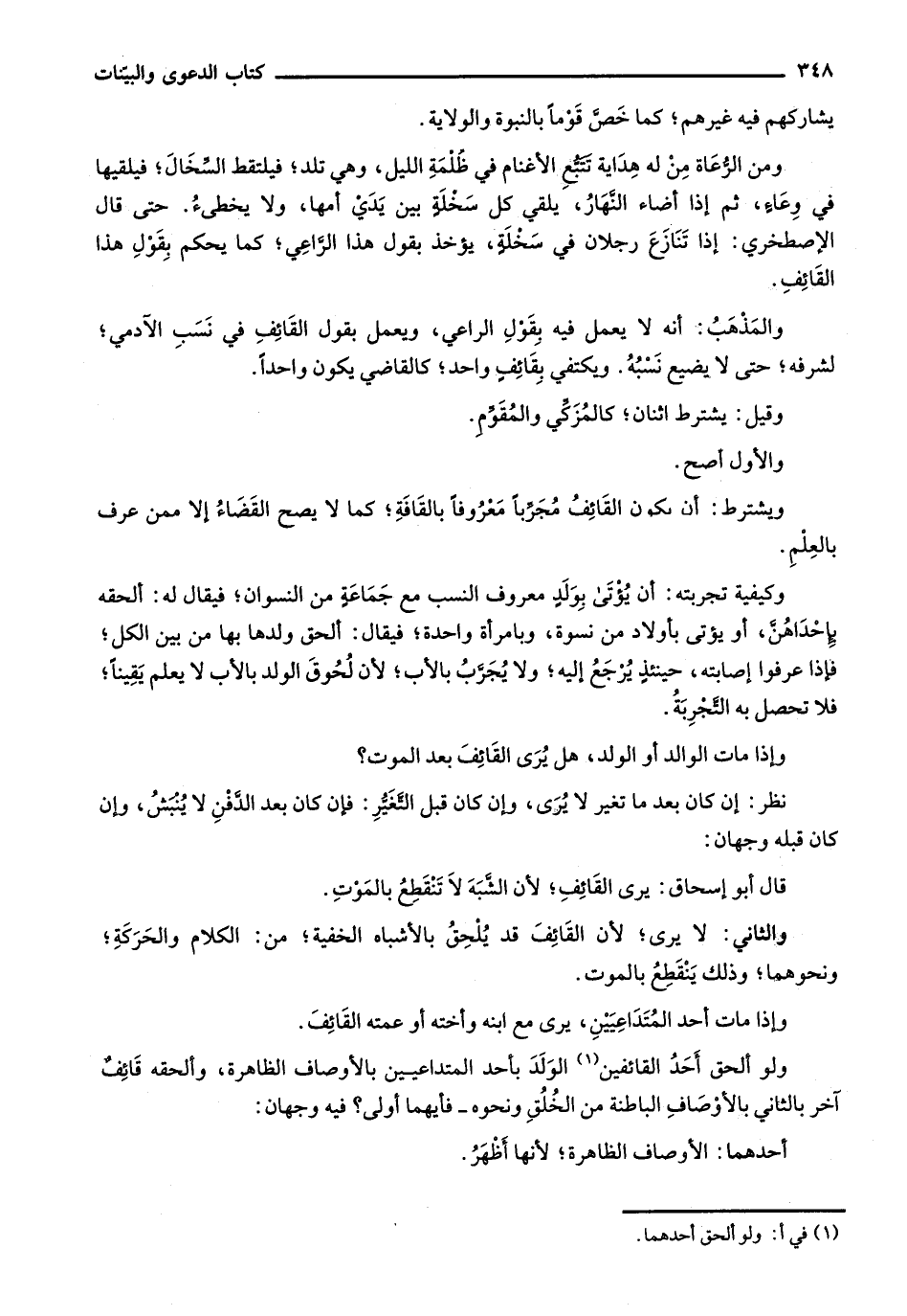 والثاني: لا يرى؛ لأن القائف قد يلحق بالأشباه الخفية، من: الكلام والحركة، ونحوهما وذلك ينقطع بالموت.