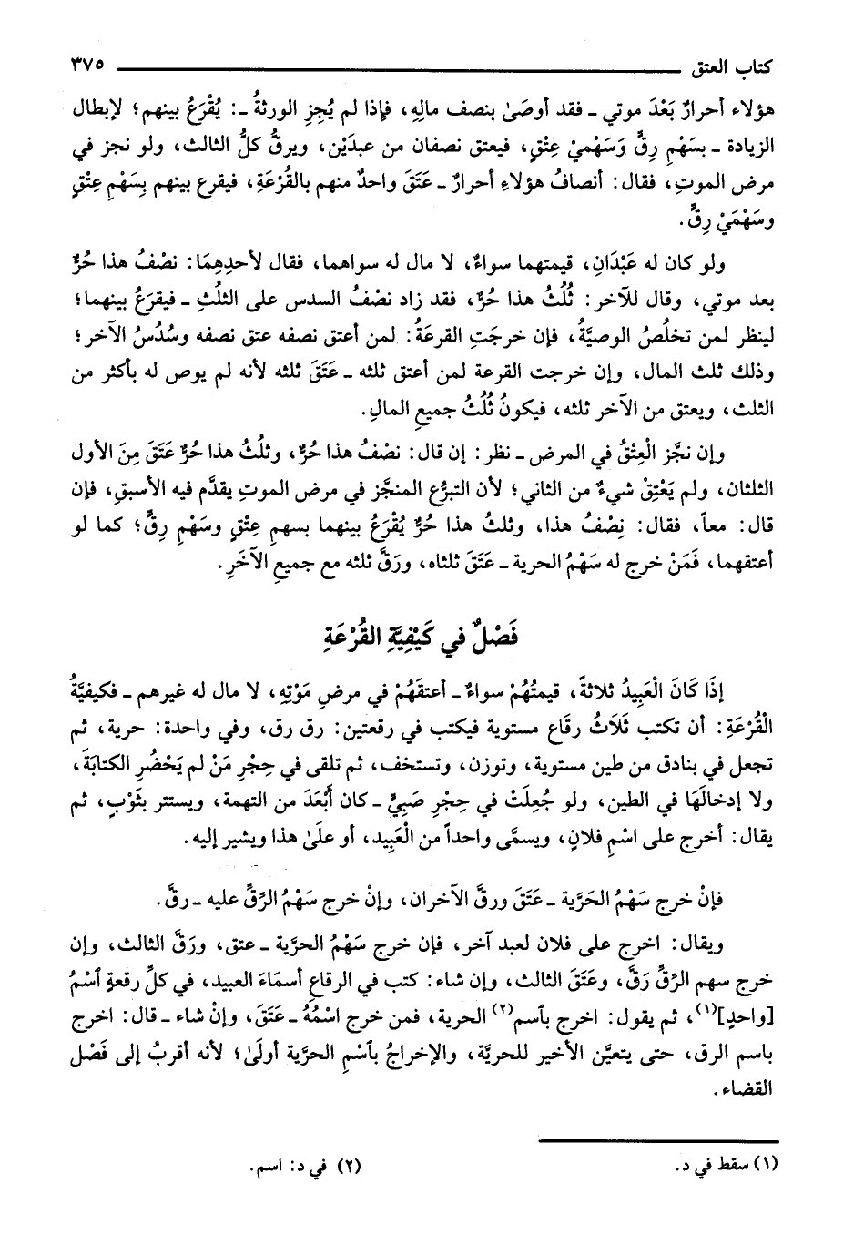ولو كان له عبدان، قيمتهما سواء، لا مال له سواهما، فقال لأحدهما: نصف هذا حر بعد موتي، وقال للآخر: ثلث هذا حر، فقد زاد نصف السدس على الثلث- فيقرع بينهما؛ لينظر لمن تخلص الوصية، فإن خرجت القرعة: لمن أعتق نصفه عتق نصفه وسدس الآخر؛ وذلك ثلث المال، وإن خرجت القرعة لمن أعتق ثلثه- عتق ثلثه لأنه لم يوص له بأكثر من الثلث، ويعتق من الآخر ثلثه، فيكون ثلث جميع المال.