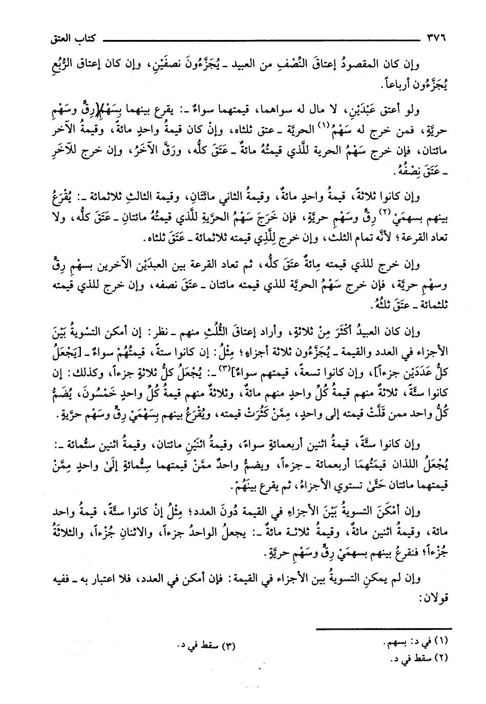 ولو أعتق عبدين، لا مال له سواهما، قيمتهما سواء-: يقرع بينهما بسهم رق وسهم حرية، فمن خرج له سهم الحرية- عتق ثلثاه، وإن كان قيمة واحد مائة، وقيمة الآخر مائتان، فإن خرج سهم الحرية للذي قيمته مائة- عتق كله، ورق الآخر، وإن خرج للآخر- عتق نصفه.