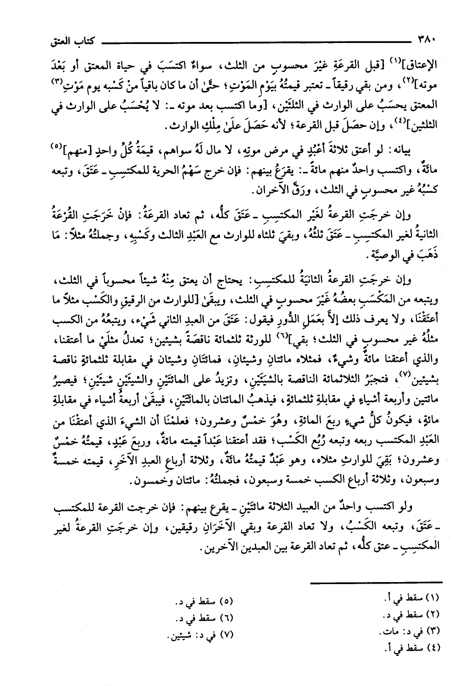 الإعتاق] [قبل القرعة غير محسوب من الثلث، سواء اكتسب في حياة المعتق أو بعد موته]، ومن بقي رقيقاً- تعتبر قيمته بيوم الموت؛ حتى أن ما كان باقياً من كسبه يوم موت المعتق يحسب على الوارث في الثلثين، [وما اكتسب بعد موته-: لا يحسب على الوارث في الثلثين]، وإن حصل قبل القرعة؛ لأنه حصل على ملك الوارث.