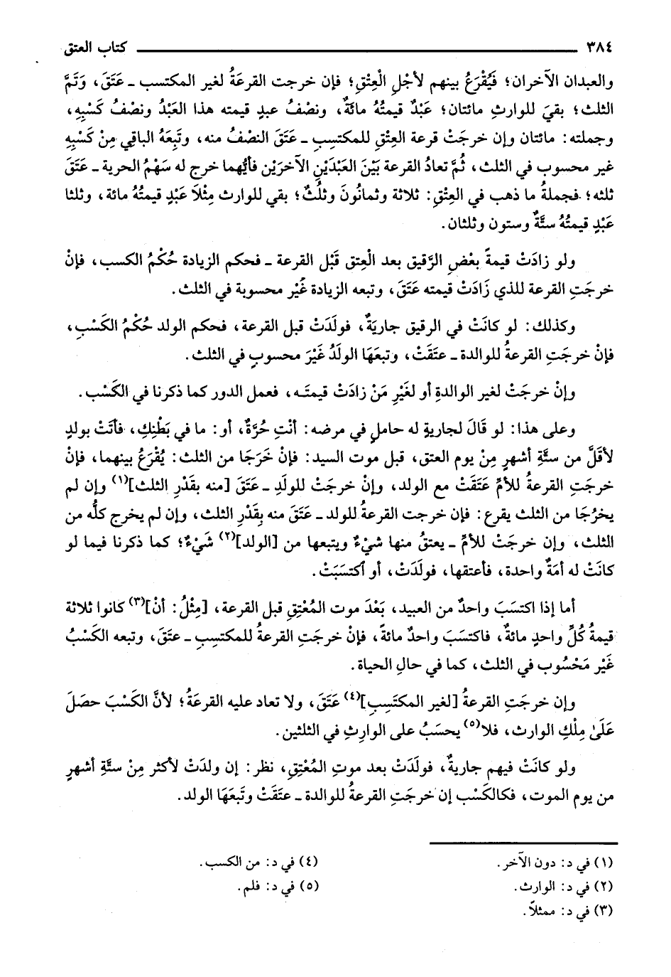 والعبدان الآخران؛ فيقرع بينهم لأجل العتق؛ فإن خرجت القرعة لغير المكتسب- عتق، وتم الثلث؛ بقي للوارث مائتان؛ عبد قيمته مائة، ونصف عبد قيمته هذا العبد ونصف كسبه، وجملته: مائتان وإن خرجت قرعة العتق للمكتسب- عتق النصف منه، وتبعه الباقي من كسبه غير محسوب في الثلث، ثم تعاد الرعة بين العبدين الآخرين فأيهما خرج له سهم الحرية- عتق ثلثه؛ فجملة ما ذهب في العتق: ثلاثة وثمانون وثلث؛ بقي للوارث مثلاً عبد قيمته مائة، وثلثا عبد قيمته ستة وستون وثلثان.