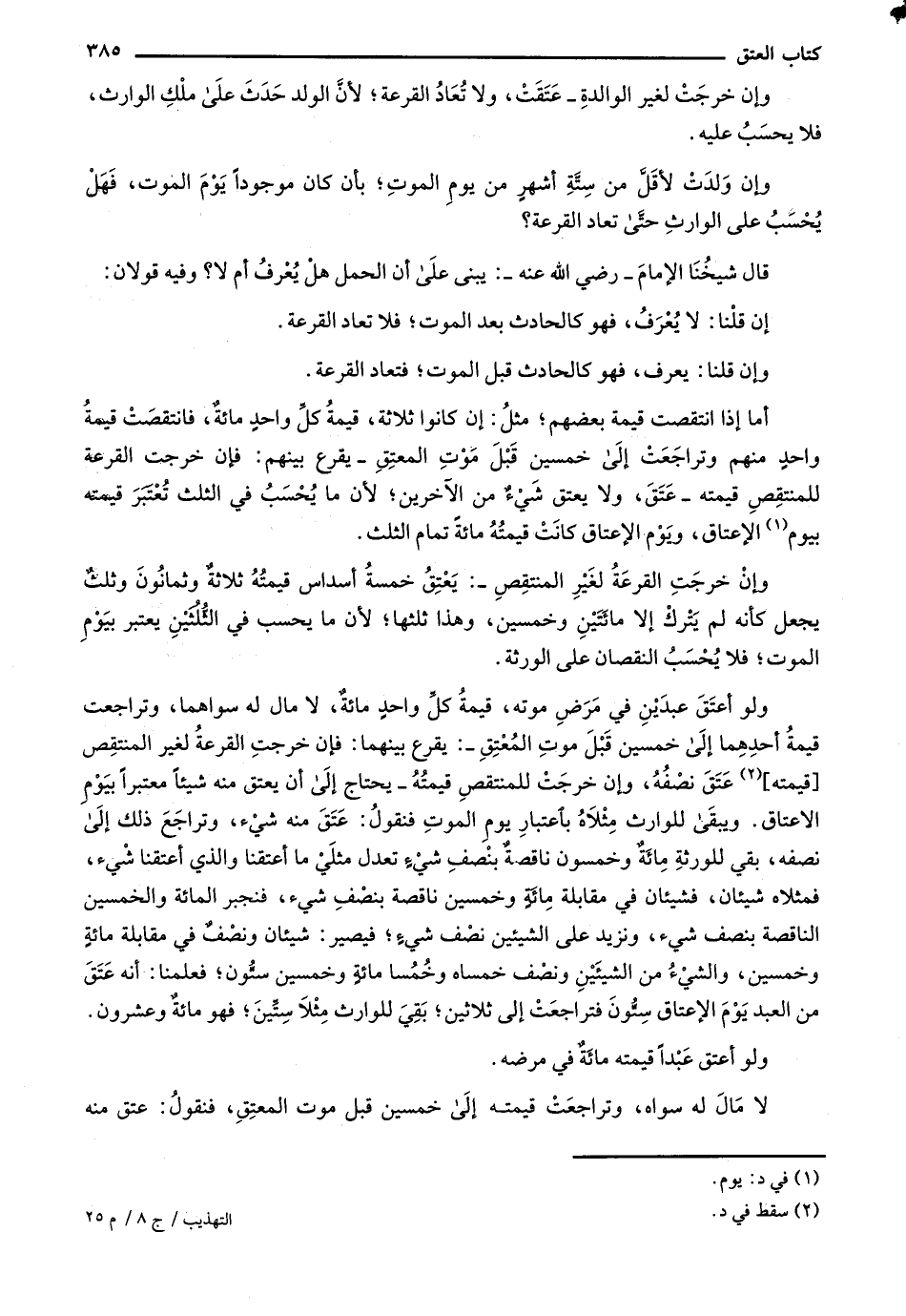 ولو أعتق عبدين في مرض موته، قيمة كل واحد مائة، لا مال له سواهما، وتراجعت قيمة أحدهما إلى خمسين قبل موت المعتق-: يقرع بينهما: فإن خرجت القرعة لغير المنتقص [قيمته] عتق نصفه، وإن خرجت للمنتقص قيمته- يحتاج إلى أن يعتق منه شيئاً معتبراً بيوم الاعتاق. ويبقى للوارث مثلاه باعتبار يوم الموت فنقول: عتق منه شيء، وتراجع ذلك إلى نصفه، بقي للورثة مائة وخمسون ناقصة بنصف شيء تعدل مثلي ما أعتقنا والذي أعتقنا شيء، فمثلاه شيئان، فشيئان في مقابلة مائة وخمسين ناقصة بنصف شيء، فنجبر المائة والخمسين الناقصة بنصف شيء، ونزيد على الشيئين نصف شيء؛ فيصير: شيئان ونصف في مقابلة مائة وخمسين، والشيء من الشيئين ونصف خمساه وخمسا مائة وخمسين ستون؛ فعلمنا: أنه عتق من العبد يوم الإعتاق ستون فتراجعت إلى ثلاثين؛ بقي للوارث مثلاً ستين، فهو مائة وعشرون.