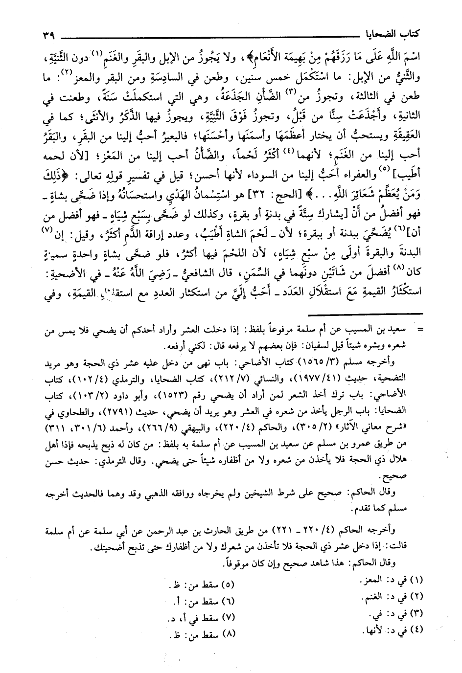 اسْمَ اللَّهِ عَلَى مَا رَزَقَهُمْ مِنْ بَهِيمَةِ الأَنْعَامِ}، ولا يجوز من الإبل والبقر والغنم دون الثنية، والثني من الإبل: ما استكمل خمس سنين، وطعن في السادسة ومن البقر والمعز: ما طعن في الثالثة، وتجوز من الضأن الجذعة، وهي التي استكملت سنة، وطعنت في الثانية، وأجذعت سناً من قبل، وتجوز فوق الثنية، ويجوز فيها الذكر والأنثى؛ كما في العقيقة ويستحب أن يختار أعظمها وأسمنها وأحسنها؛ فالبعير أحب إلينا من البقر، والبقر أحب إلينا من الغنم؛ لأنهما أكثر لحماً، والضأن أحب إلينا من المعز؛ [لأن لحمه أطيب] والعفراء أحب إلينا من السوداء لأنها أحسن؛ قيل في تفسير قوله تعالى: {ذَلِكَ وَمَنْ يُعَظِّمْ شَعَائِرَ اللَّهِ} [الحج: 32] هو استسمان الهدي واستحسانه وإذا ضحى بشاة- فهو أفضل من أن [يشارك ستة في بدنة أو بقرة، وكذلك لو ضحى بسبع شياه- فهو أفضل من أن] يضحي ببدنة أو ببقرة؛ لأن- لحم الشاة أطيب، وعدد إراقة الدم أكثر، وقيل: إن البدنة والبقرة أولى من سبع شياه، لأن اللحم فيها أكثر، فلو ضحى بشاة واحدة سمينة كان أفضل من شاتين دونهما في السمن، قال الشافعي- رضي الله عنه- في الأضحية: استكثار القيمة مع استقلال العدد- أحب إلي من استكثار العدد مع استقلال القيمة، وفي