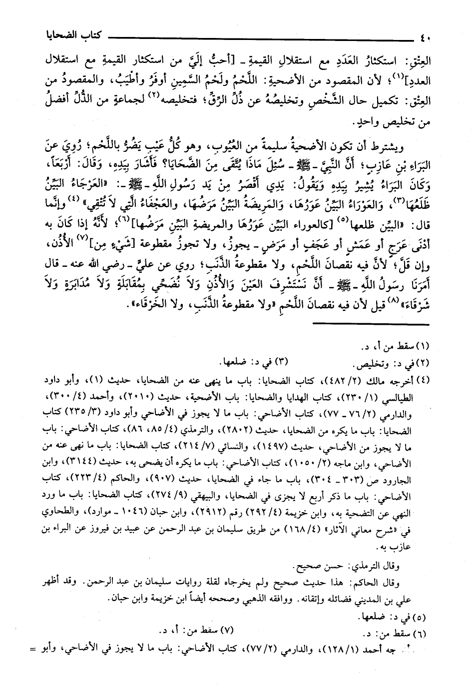 ويشترط أن تكون الأضحية سليمة من العيوب، وهو كل عيب يضر باللحم؛ روي عن البراء بن عازب؛ ان النبي- صلى الله عليه وسلم- سئل ماذا يتقى من الضحايا؟ فأشار بيده، وقال: أربعاً، وكان البراء يشير بيده ويقول: يدي أقصرم ن يد رسول الله - صلى الله عليه وسلم-: "العرجاء البين ظلعها، والعوراء البين عورها، والمريضة البين مرضها، والعجفاء التي لا تتقي" وإنما قال: "البين ظلعها [كالعوراء البين عورها والمريضة البين مرضها]؛ لأنه إذا كان به أدنى عرج أو عمش أو عجف أو مرض- يجوز، ولا تجوز مقطوعة [شيء من] الأذن، وإن قل؛ لأن فيه نقصان اللحم، ولا مقطوعة الذنب؛ روي عن علي- رضي الله عنه- قال أمرنا رسول الله صلى الله عليه وسلم أن نستشرف العين والأذن ولا نضحي بمقابلة ولا مدابرة ولا شرقاء" قيل لأن فيه نقصان اللحم "ولا مقطوعة الذنب، ولا الخرقاء".