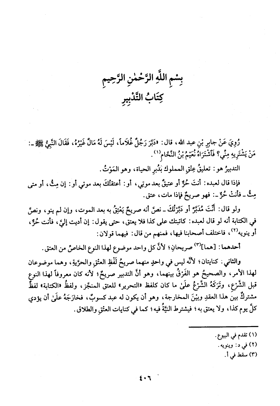 روي عن جابر بن عبد الله، قال: "دبر رجل غلاماً، ليس له مال غيره، فقال النبي صلى الله عليه وسلم-: من يشتريه مني؟ فاشتراه نعيم بن النحام.