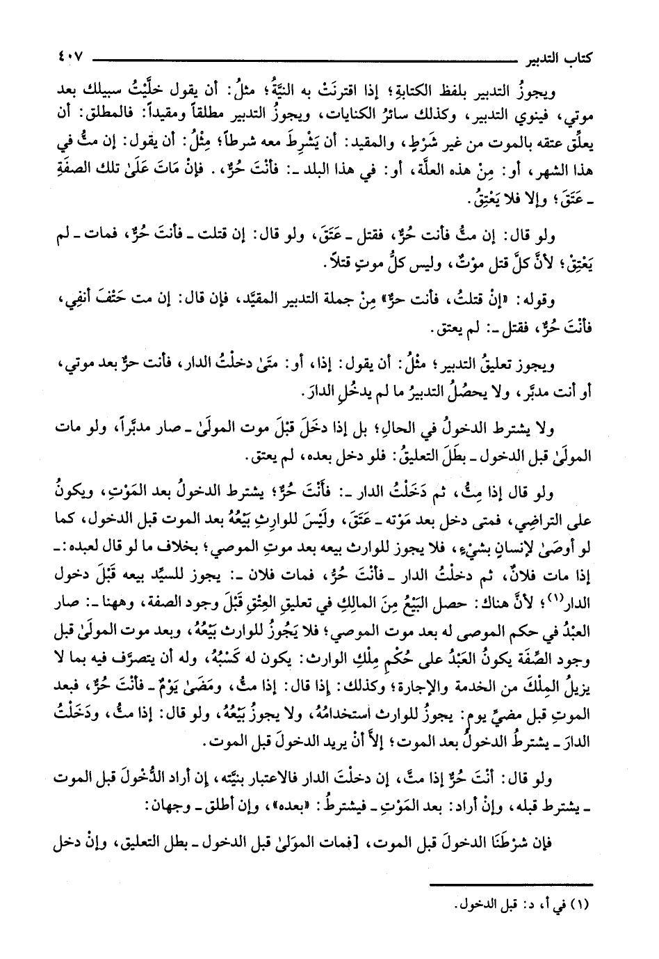 ويجوز التدبير بلفظ الكتابة؛ إذا اقترنت به النية؛ مثل: أن يقول خليت سبيلك بعد موتي، فينوي التدبير، وكذلك سائر الكنايات، ويجوز التدبير مطلقاً ومقيداً: فالمطلق: أن يعلق عتقه بالموت من غير شرط، والمقيد: أن يشرط معه شرطاً؛ مثل: أن يقول: إن مت في هذا الشهر، أو: من هذه العلة، أو: في هذا البلد-: فأنت حر، فإن مات على تلك الصفة - عتق؛ وإلا فلا يعتق.