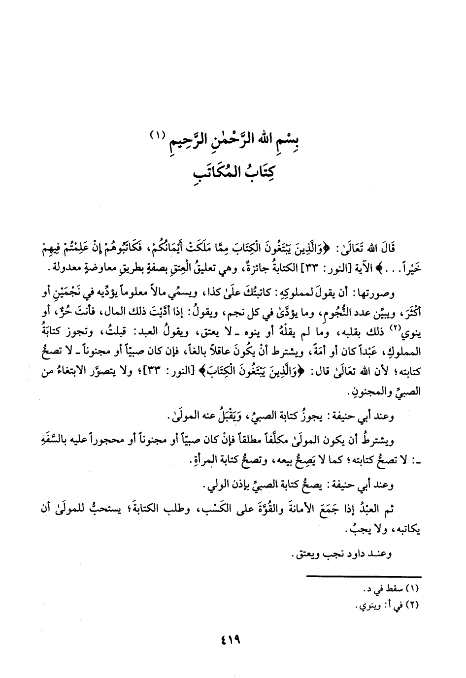 قال الله تعالى: {وَالَّذِينَ يَبْتَغُونَ الْكِتَابَ مِمَّا مَلَكَتْ أَيْمَانُكُمْ فَكَاتِبُوهُمْ إِنْ عَلِمْتُمْ فِيهِمْ خَيْراً} الآية [النور: 33] الكتابة جائزة، وهي تعليق العتق بصفة بطريق معاوضة معدولة.