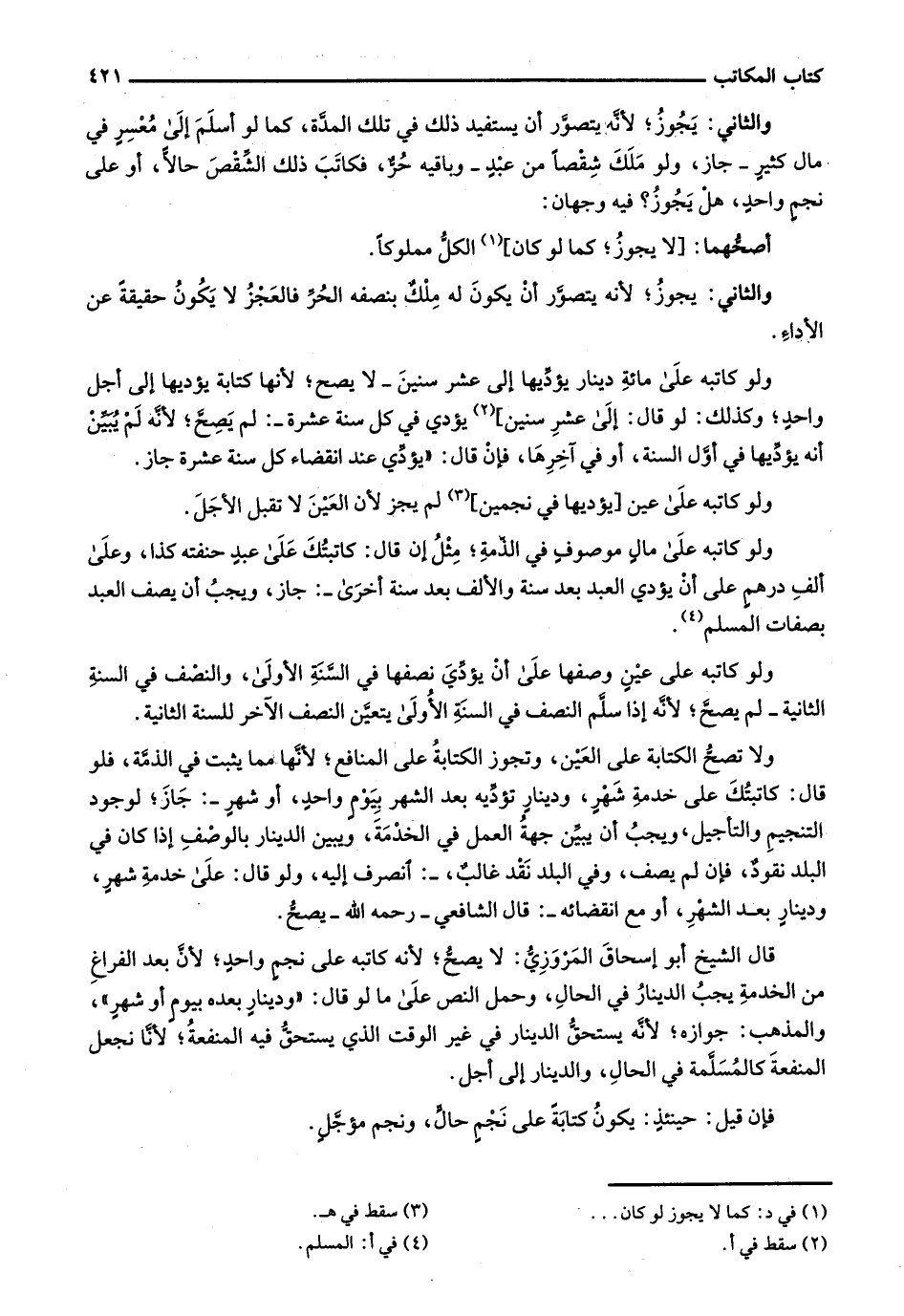 ولو كاتبه على مال موصوف في الذمة؛ مثل إن قال: كاتبتك على عبد حنفته كذا، وعلى ألف درهم على أن يؤدي العبد بعد سنة والألف بعد سنة أخرى-: جاز، ويجب أن يصف العبد بصفات المسلم.