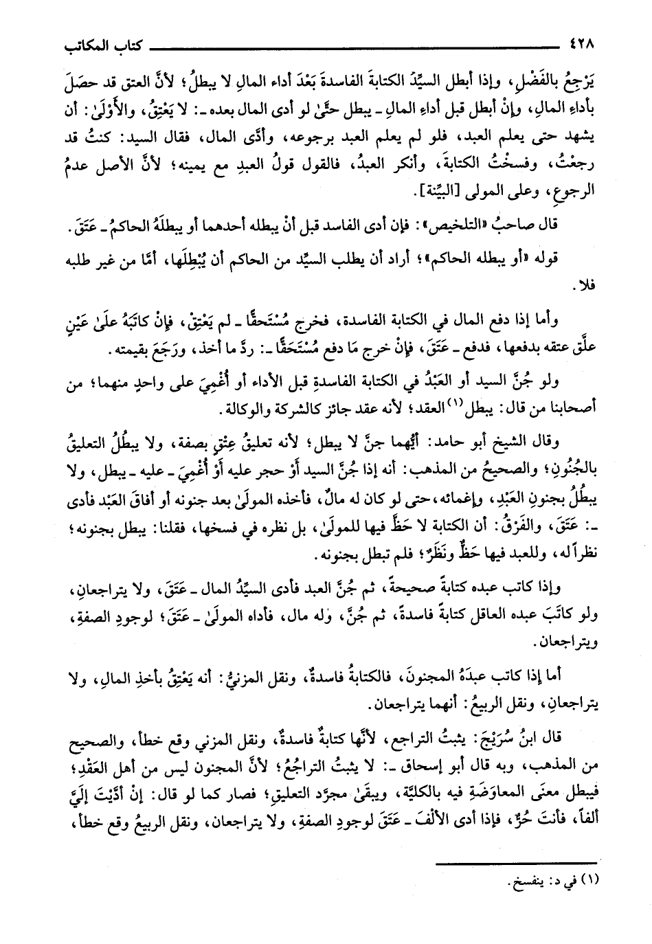 يرجع بالفضل، وإذا أبطل السيد الكتابة الفاسدة بعد أداء المال لا يبطل؛ لأن العتق قد حصل بأداء المال، وإن أبطل قبل أداء المال- يبطل حتى لو أدى المال بعده-: لا يعتق، والأولى: أن يشهد حتى يعلم العبد، فلو لم يعلم العبد برجوعه، وأدى المال، فقال السيد: كنت قد رجعت، وفسخت الكتابة، وأنكر العبد، فالقول قول العبد مع يمينه؛ لأن الأصل عدم الرجوع، وعلى المولى [البينة].