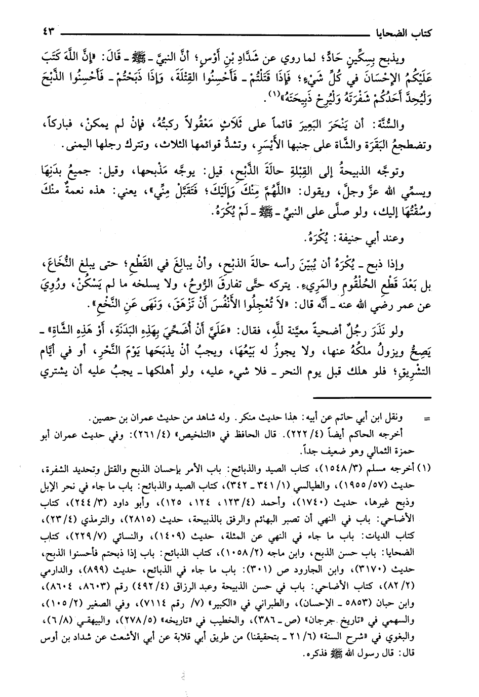وتوجه الذبيحة إلى القبلة حالة الذبح، قيل: يوجه مذبحها، وقيل: جميع بدنها ويسمي الله عز وجل، ويقول: "اللهم منك وإليك؛ فتقبل مني"، بعني"، يعني: هذه نعمة منك وسقتها إليك، ولو صلى على النبي- صلى الله عليه وسلم- لم يكره.