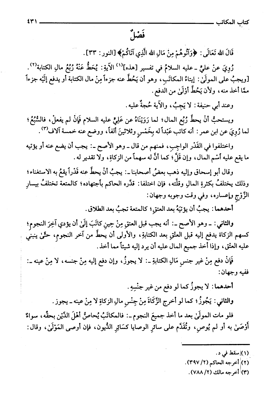 روي عن علي- عليه السلام في تفسير [هذه] الآية: يحط عنه ربع مال الكتابة. [ويجب على المولى: إيتاء المكاتب، وهو أن يحط عنه جزءاً من مال الكتابة أو يدفع إليه جزءاً مما أخذ منه، ولأن يحط أولى من الدفع.