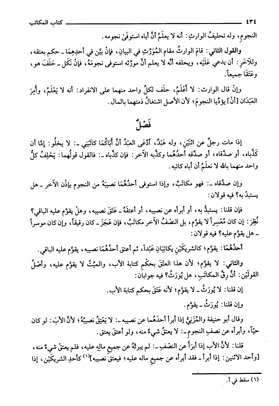 وقال أبو حنيفة والمزني إذا أبرأ أحدهما عن نصيبه-: لا يعتق نصيبه؛ لأن الأب: لو كان حياً، وأبرأه عن نصف النجوم-: لا يعتق شيء منه، ولو أعتق يعتق.