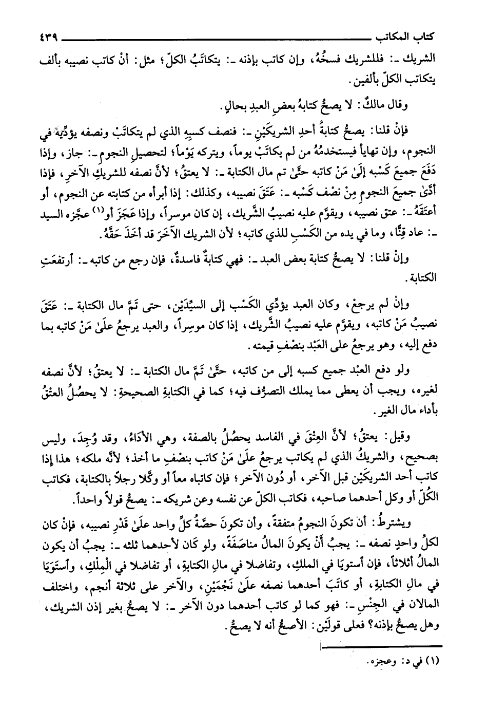 وقيل: يعتق؛ لأن العتق في الفاسد يحصل بالصفة، وهي الأداء، وقد وجد، وليس بصحيح، والشريك الذي لم يكاتب يرجع على من كاتب بنصف ما أخذ؛ لأنه ملكه؛ هذا إذا كاتب أحد الشريكين قبل الآخر، أو دون الآخر؛ فإن كاتباه معاً أو وكلا رجلاً بالكتابة، فكاتب الكل أو وكل أحدهما صاحبه، فكاتب الكل عن نفسه وعن شريكه-: يصح قولاً واحداً.