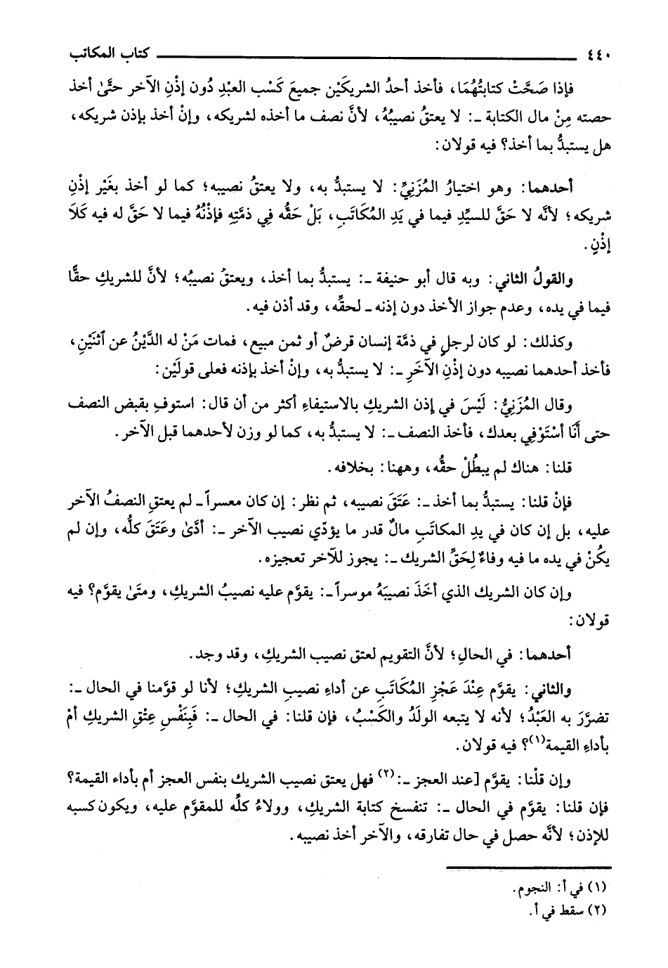 فإذا صحت كتابتهما، فأخذ أحد الشريكين جميع كسب العبد دون إذن الآخر حتى أخذ حصته من مال الكتابة-: لا يعتق نصيبه، لأن نصف ما أخذه لشريكه، وإن أخذ بإذن شريكه، هل يستبد بما أخذ؟ فيه قولان: