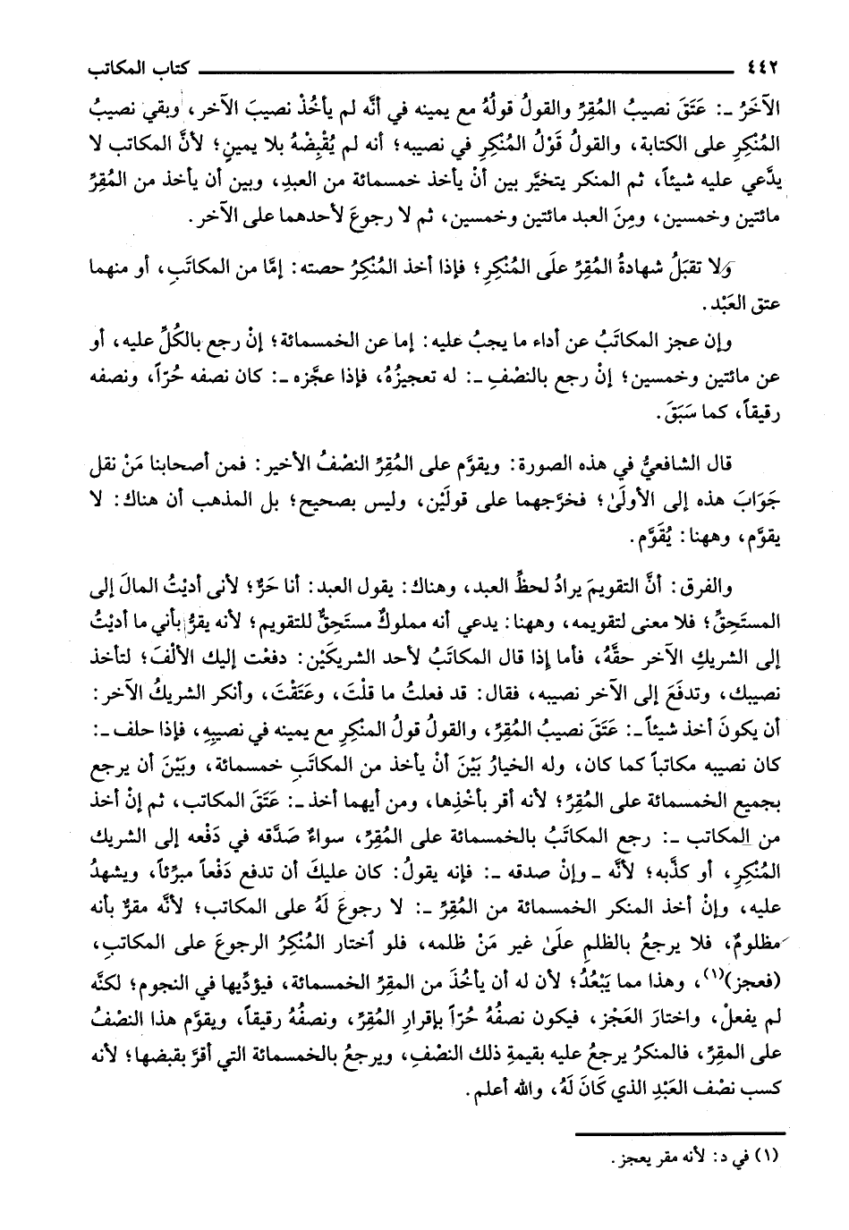الآخر-: عتق نصيب المقر والقول قوله مع يمينه في أنه لم يأخذ نصيب الآخر، وبقي نصيب النمكر على الكتابة، والقول قول المنكر في نصيبه؛ أنه لم يقبضه بلا يمين؛ لأن المكاتب لا يدعي عليه شيئاً، ثم المنكر يتخير بين أن يأخذ خمسمائة من العبد، وبين أن يأخذ من المقر مائتين وخمسين، ومن العبد مائتين وخمسين، ثم لا رجوع لأحدهما على الآخر.