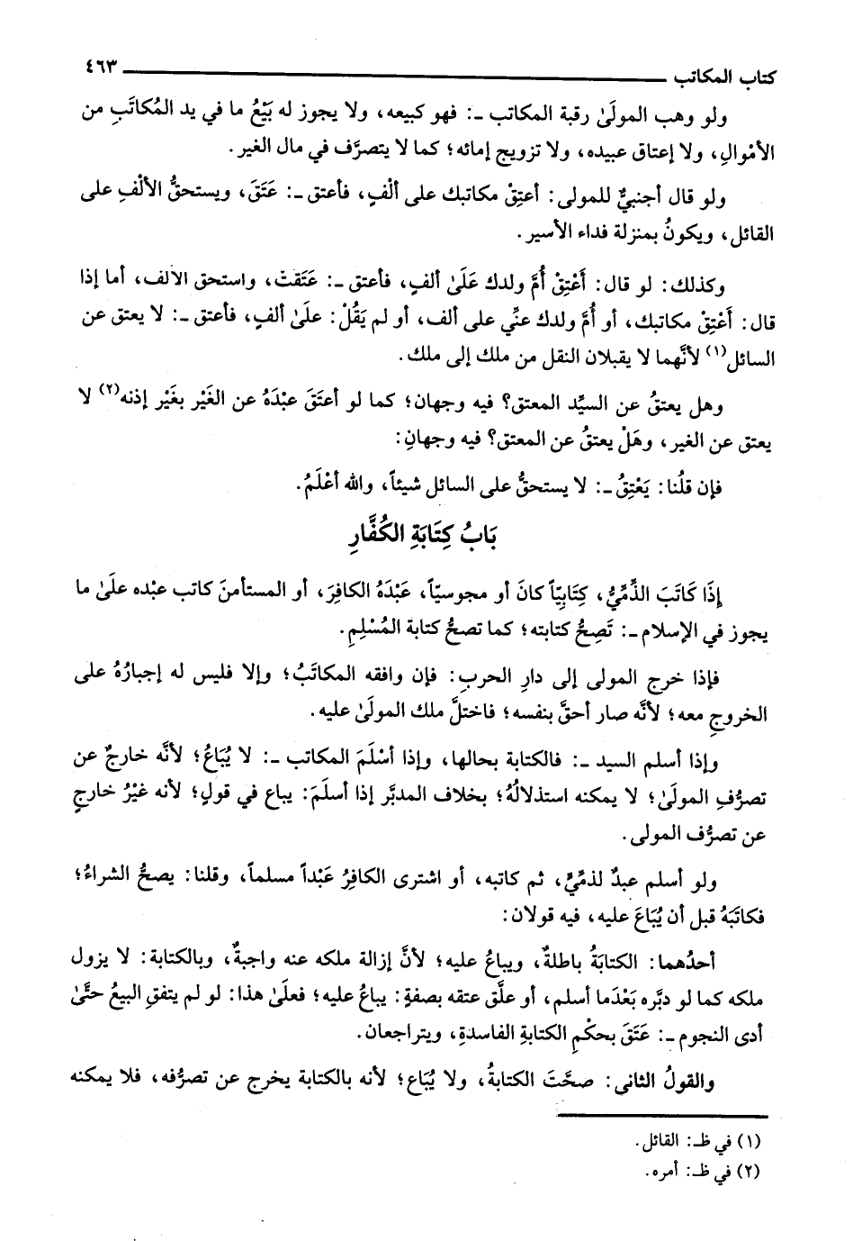 وإذا أسلم السيد: فالكتابة بحالها، وإذا أسلم المكاتب: لا يباع؛ لأنه خارج عن تصرف المولى؛ لا يمكنه استذلاله؛ بخلاف المدبر إذا أسلم: يباع في قول؛ لأنه غير خارج عن تصرف المولى.