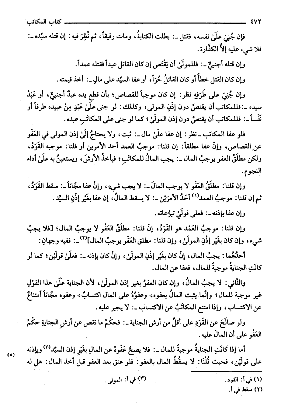 والثاني: لا يجب المال، وإن كان العفو بغير إذن المولى، لأن الجناية على هذا القول غير موجبة للمال؛ وإنما يثبت المال بعفوه، وعفوه على المال اكتساب، وعفوه مجاناً امتناع عن الاكتساب، وإذا امتنع المكاتب عن الاكتساب: لا يجبر عليه.