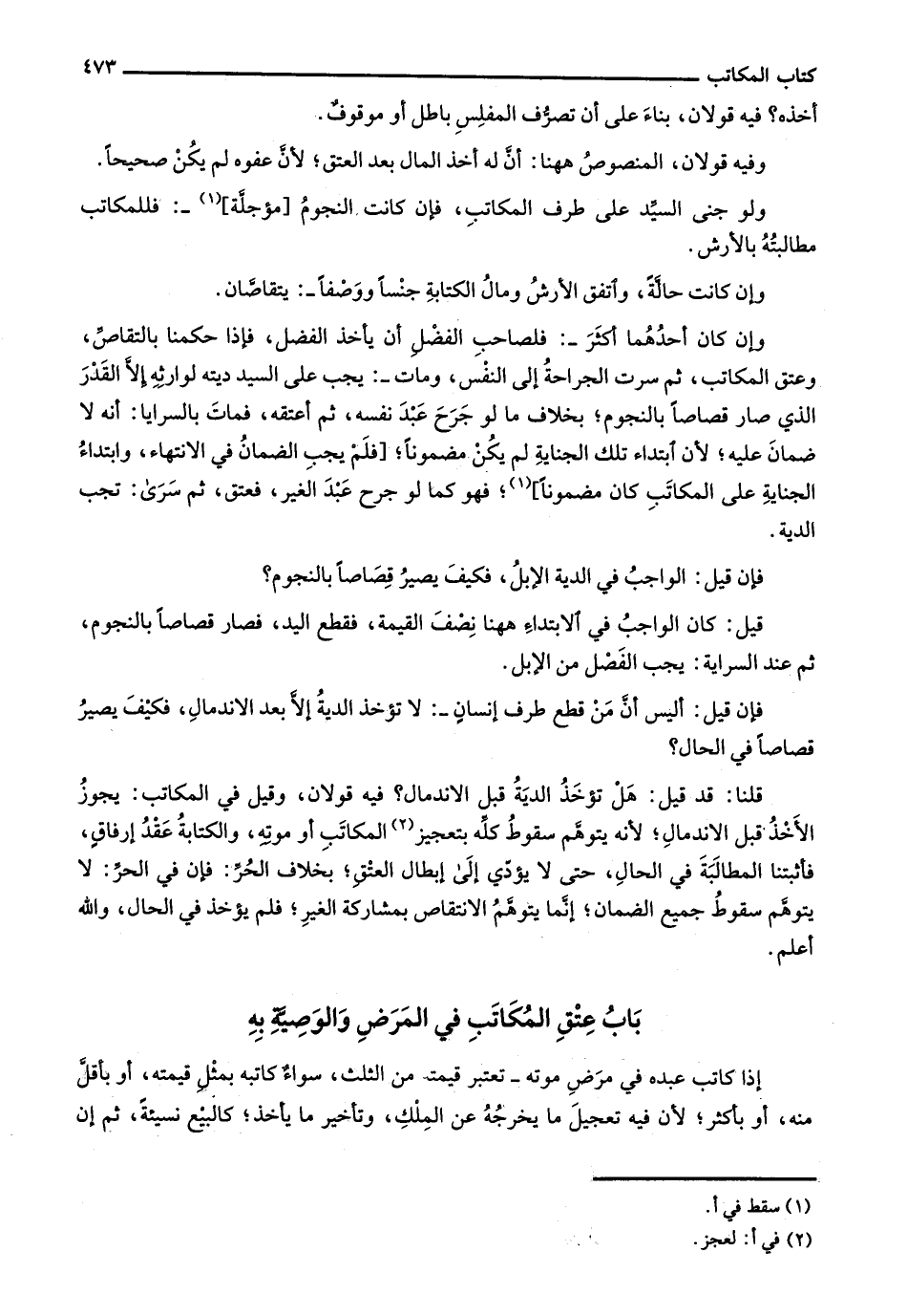 قلنا: قد قيل: هل تؤخذ الدية قبل الاندمال؟ فيه قولان، وقيل في المكاتب: يجوز الأخذ قبل الاندمال؛ لأنه يتوهم سقوط كله بتعجيز المكاتب أو موته، والكتابة عقد إرفاق، فأثبتنا المطالبة في الحال، حتى لا يؤدي إلى إبطال العتق؛ بخلاف الحر: فإن في الحر: لا يتوهم سقوط جميع الضمان؛ إنما يتوهم الانتقاص بمشاركة الغير؛ فلم يؤخذ في الحال، والله أعلم.