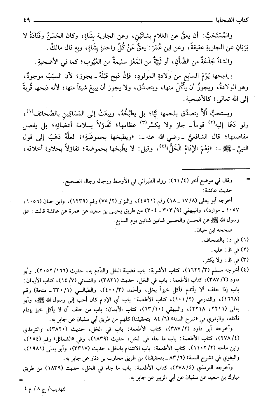 ويستحب ألا يتصدق بلحمها نياً؛ بل يطبخه، ويبعث إلى المساكين بالصحائف، ولو دعا إليه قوماً- جاز ولا يكسر عظامها؛ تفاؤلاً بسلامة أعضائه؛ بل يفصل مفاصلها؛ قال الشافعي- رضي الله عنه-: "ويطبخها بحموضة"؛ لعله ذهب إلى قول النبي- صلى الله عليه وسلم-: "نعم الإدام الخل"، وقيل: لا يطبخها بحموضة؛ تفاؤلاً بحلاوة أخلاقه،
