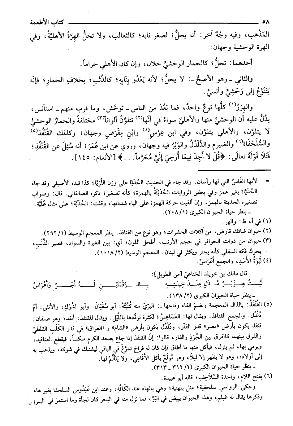 والهرر كلها نوع واحد، فما بعد من الناس- توحش، وما قرب منهم- استأنس، يدل عليه أن الوحشي منها والأهلي سواء في أنها تتلون ألواناً مختلفة والحمار الوحشي لا يتلون، والأهلي يتلون، وفي ابن عرس وابن مقرض وجهان؛ وكذلك القنفذ والسلحفاة والضيرم والدلدل والوبر فيه وجهان، وروي عن ابن عمر؛ أنه سئءل عن القنفذ؛ فتلا قوله تعالى: {قُلْ لا أَجِدُ فِي مَا أُوحِيَ إِلَيَّ مُحَرَّماً ...} [الأنعام: 145].