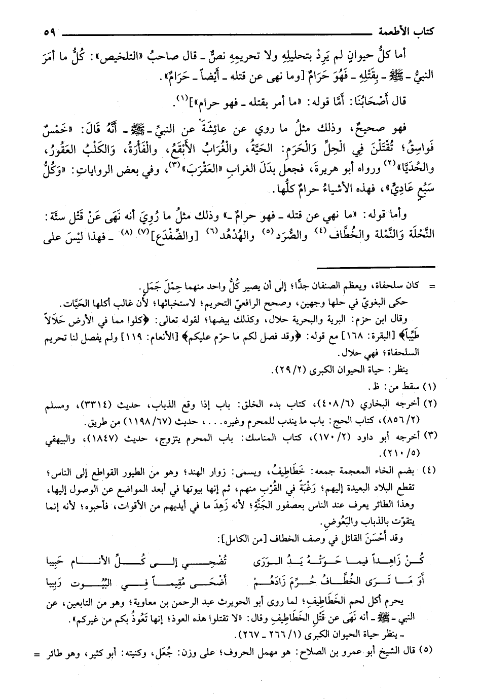 وأما قوله: "ما نهى عن قتله- فهو حرام" وذلك مثل ما روي أنه نهى عن قتل ستة: النحلة والنملة والخطاف والصرد والهدهد [والضفدع]- فهذا ليس على
