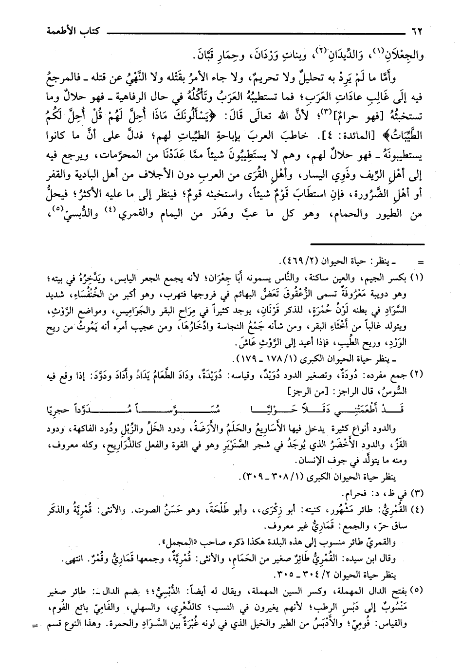 وأما ما لم يرد به تحليل ولا تحريم، ولا جاء الأمر بقتله ولا النهي عن قتله- فالمرجع فيه إلى غالب عادات العرب؛ فما تستطيبه العرب وتأكله في حال الرفاهية- فهو حلال وما تستخبثه [فهو حرام]؛ لأن الله تعالى قال: {يَسْأَلُونَكَ مَاذَا أُحِلَّ لَهُمْ قُلْ أُحِلَّ لَكُمْ الطَّيِّبَاتُ} [المائدة: 4] خاطب العرب بإباحة الطيبات لهم؛ فدل على أن ما كانوا يستطيبونه- فهو حلال لهم، وهم لا يستطيبون شيئاً مما عددنا من المحرمات، ويرجع فيه إلى أهل الريف وذوي اليسار، وأهل القرى من العرب دون الأجلاف من أهل البادية والقفر أو أهل الضرورة، فإن استطاب قوم شيئاً، واستخبثه قوم؛ فينظر إلى ما عليه الأكثر؛ فيحل من الطيور والحمام، وهو كل ما عب وهدر من اليمام والقمري والدبسي،