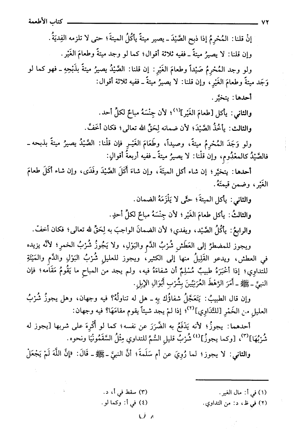 ولو وجد المحرم ميتة، وصيداً، وطعام الغير فإن قلنا: الصيد يصير ميتة بذبحه- فالصيد كالمعدوم، وإن قلنا: لا يصير ميتة- ففيه أربعة أقوال: