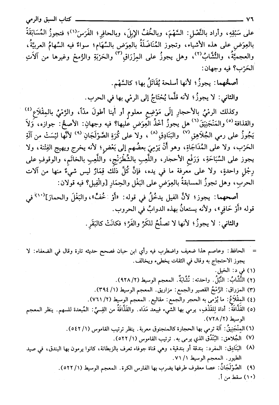 على سبقه، وأراد بالنصل: السهم، وبالخف الإبل، وبالحافر؛ الفرس؛ فتجوز المسابقة بالعوض على هذه الأشياء، وتجوز المناضلة بالعوض بالسهام؛ سواء فيه السهام العربية، والعجمية، والنشاب، وهل يجوز على المزراق، والحربة والرمح وغيرها من آلات الحرب؟ فيه وجهان:
