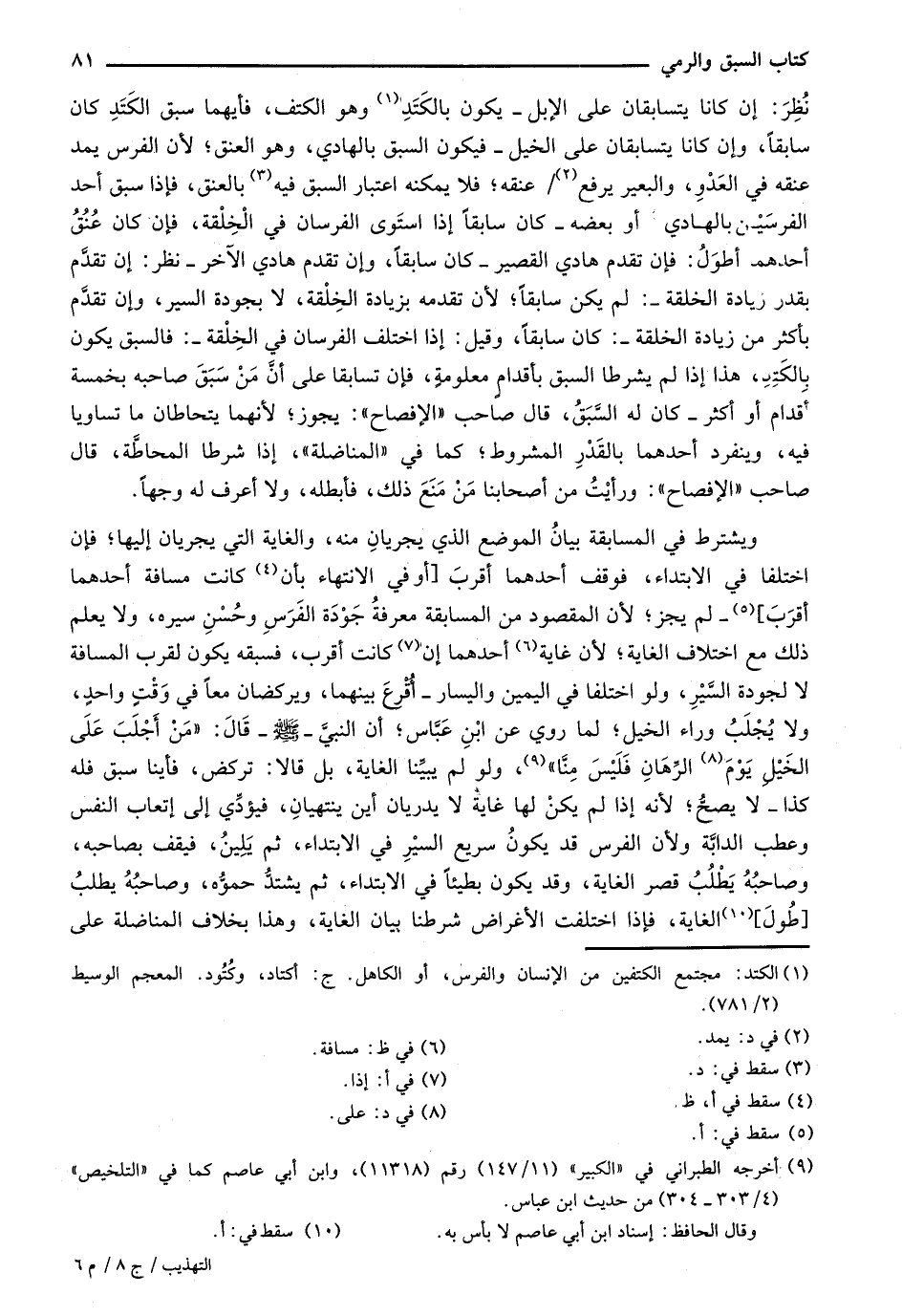 نُظِرَ: إن كانا يتسابقان على الإبل- يكون بالكتد وهو الكتف، فأيهما سبق الكتد كان سابقاً، وإن كانا يتسابقان على الخيل- فيكون السبق بالهادي، وهو العنق؛ لأن الفرس يمد عنقه في العدو، والبعير يرفع/ عنقه؛ فلا يمكنه اعتبار السبق فيه بالعنق، فإذا سبق أحد الفرسين بالهادي أو بعضه- كان سابقاً إذا استوى الفرسان في الخلقة، فإن كان عنق أحدهما أطول: فإن تقدم هادي القصير- كان سابقاً، وإن تقدم هادي الآخر- نظر: إن تقدم بقدر زيادة الخلقة-: لم يكن سابقاً؛ لأن تقدمه بزيادة الخلقة، لا بجودة السير، وإن تقدم بأكثر من زيادة الخلقة-: كان سابقاً، وقيل: إذا اختلف الفرسان في الخلقة-: فالسبق يكون بالكتد، هذا إذا لم يشرطا السبق بأقدام معلومة، فإن تسابقا على أن من سبق صاحبه بخمسة أقدام أو أكثر- كان له السبق، قال صاحب "الإفصاح": يجوز؛ لأنهما يتحاطان ما تساويا فيه، وينفرد أحدهما بالقدر المشروط؛ كما في "المناضلة"، إذا شرطا المحاطة، قال صاحب "الإفصاح": ورأيت من أصحابنا من منع ذلك، فأبطله، ولا أعرف له وجهاً.