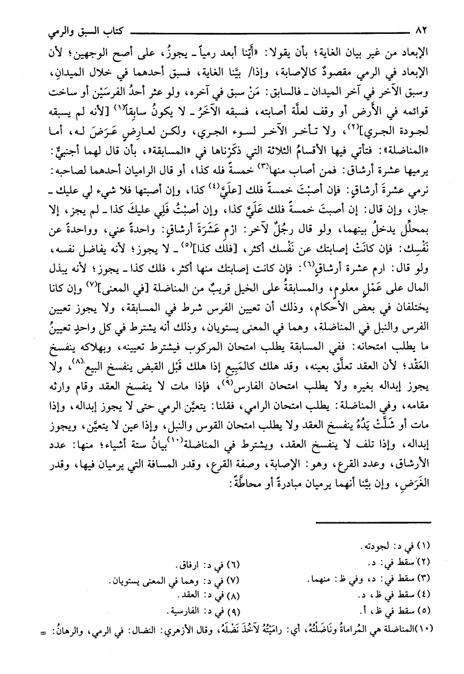 الإبعاد من غير بيان الغاية؛ بأن يقولا: "أينا أبعد رمياً- يجوز، على أصح الوجهين؛ لأن الإبعاد في الرمي مقصود كالإصابة، وإذا/ بينا الغاية، فسبق أحدهما في خلال الميدان، وسبق الآخر في آخر الميدان- فالسابق: من سبق في آخره، ولو عثر أحد الفرسين أو ساخت قوائمه في الأرض أو وقف لعلة أصابته، فسبقه الآخر- لا يكون سابقاً [لأنه لم يسبقه لجودة الجري]، ولا تأخر الآخر لسوء الجري، ولكن لعارض عرض له، أما "المناضلة": فتأتي فيها الأقسام الثلاثة التي ذكرناها في "المسابقة"، بأن قال لهما أجنبي: يرميها عشرة أرشاق: فمن أصاب منها خمسة فله كذا، أو قال الراميان أحدهما لصاحبه: نرمي عشرة أرشاق: فإن أصبت خمسة فلك [علي كذا، وإن أصبتها فلا شيء لي عليك- جاز، وإن قال: إن أصبت خمسة فلك علي كذا، وإن أصبت فلي عليك كذا- لم يجز، إلا بمحلل يدخل بينهما، ولو قال رجل لآخر: ارم عشرة أرشاق: واحدة عني، وواحدة عن نفسك: فإن كانت إصابتك عن نفسك أكثر، [فلك كذا]- لا يجوز؛ لأنه يفاضل نفسه، ولو قال: ارم عشرة أرشاق: فإن كانت إصابتك منها أكثر، فلك كذا- يجوز؛ لأنه يبذل المال على عمل معلوم، والمسابقة على الخيل قريب من المناضلة [في المعنى] وإن كانا يختلفان في بعض الأحكام، وذلك أن تعيين الفرس شرط في المسابقة، ولا يجوز تعيين الفرس والنبل في المناضلة، وهما في المعنى يستويان، وذلك أنه يشترط في كل واحد تعيين ما يطلب امتحانه: ففي المسابقة يطلب امتحان المركوب فيشترط تعيينه، وبهلاكه ينفسخ العقد؛ لأن العقد تعلق بعينه، وقد هلك كالمبيع إذا هلك قبل القبض ينفسخ البيع، ولا يجوز إبداله بغيره ولا يطلب امتحان الفارس، فإذا مات لا ينفسخ العقد وقام وارثه مقامه، وفي المناضلة: يطلب امتحان الرامي، فقلنا: يتعين الرمي حتى لا يجوز إبداله، وإذا مات أو شلت يده ينفسخ العقد ولا يطلب امتحان القوس والنبل، وإذا عين لا يتعين، ويجوز إبداله، وإذا تلف لا ينفسخ العقد، ويشترط في المناضلة بيان ستة أشياء؛ منها: عدد الأرشاق، وعدد القرع، وهو: الإصابة، وصفة القرع، وقدر المسافة التي يرميان فيها، وقدر الغرض، وإن بينا أنهما يرميان مبادرة أو محاطة: