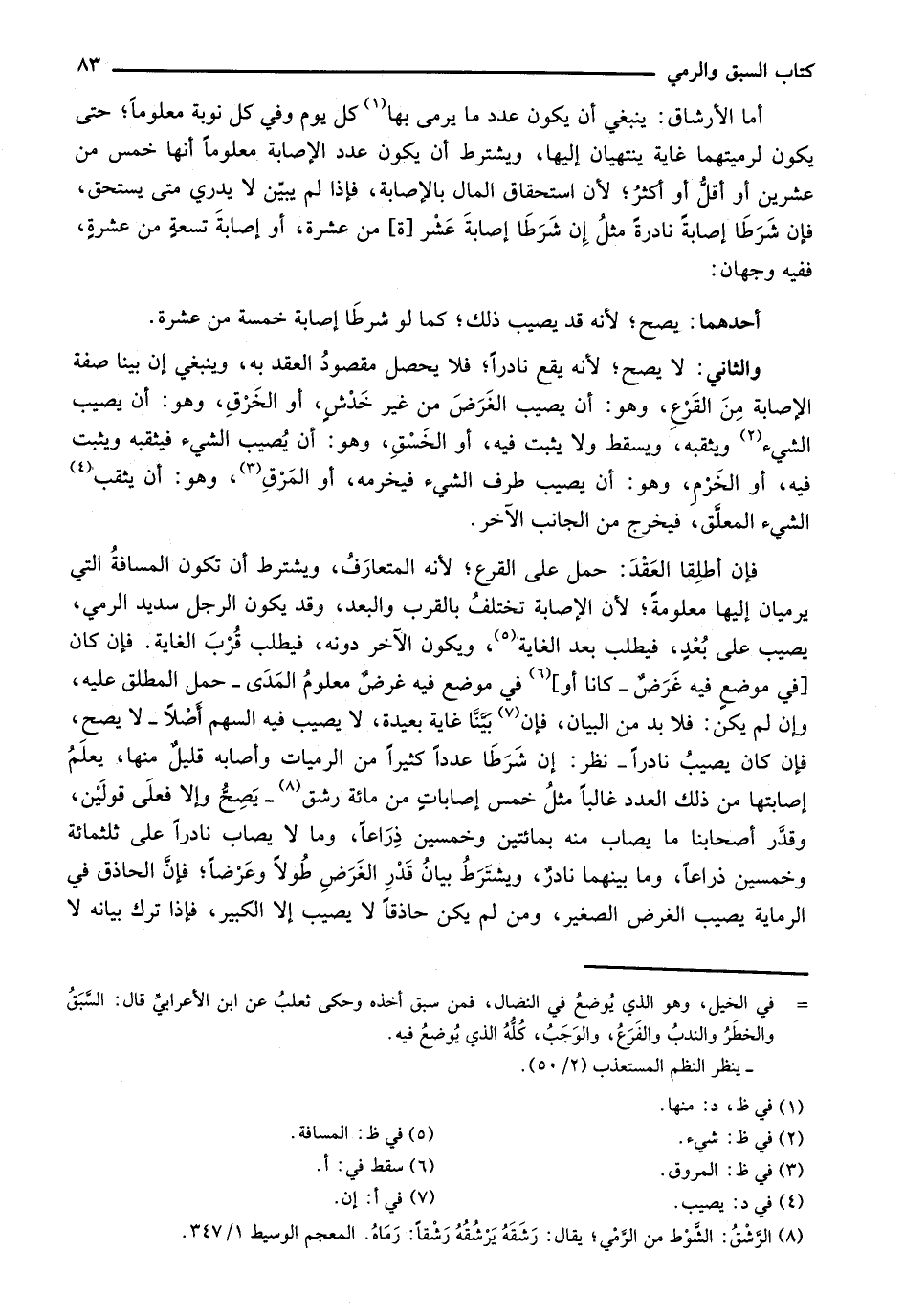 أما الأرشاق: ينبغي أن يكون عدد ما يرمى بها كل يوم وفي كل نوبة معلوماً؛ حتى يكون لرميتهما غاية ينتهيان إليها، ويشترط أن يكون عدد الإصابة معلوماً أنها خمس من عشرين أو أقل أو أكثر؛ لأن استحقاق المال بالإصابة، فإذا لم يبين لا يدري متى يستحق، فإن شرطا إصابة نادرة مثل إن شرطا إصابة عشر [ة] من عشرة، أو إصابة تسعة من عشرة، ففيه وجهان: